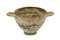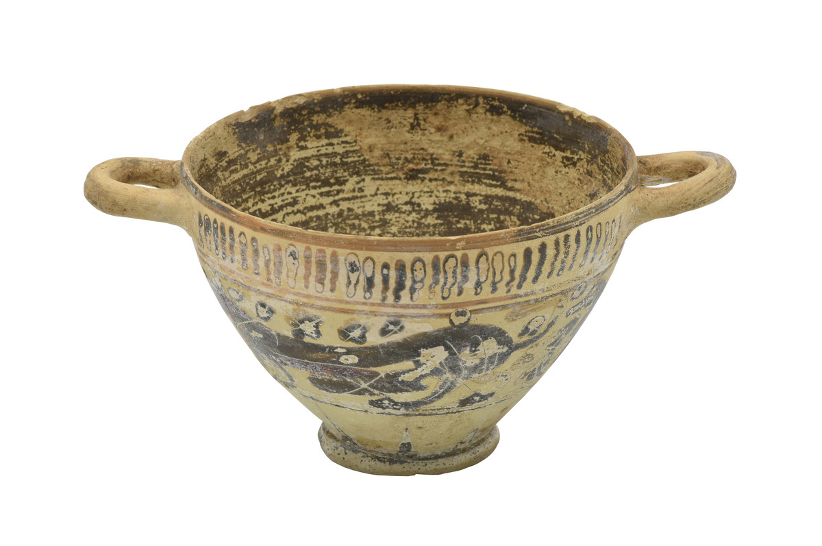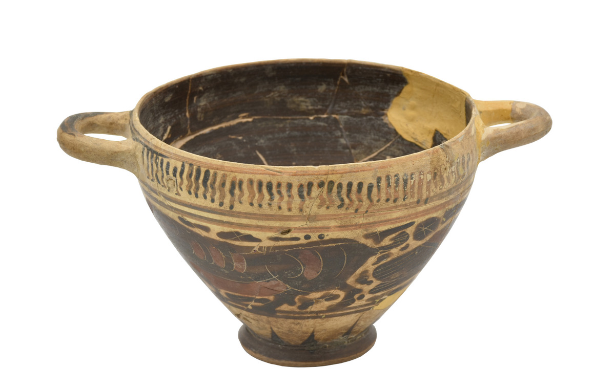 DUE SKYPHOI ETRUSCO CORINZI DATAZIONE: VI sec. a. C. MATERIA E TECNICA: argilla figulina camoscio; vernice bruna, suddipinture in bianco e paonazzo; dettagli resi a graffito; modellati a tornio veloce Due skyphoi a vasca troncocononica, piede ad anello e anse a bastoncello impostate orizzontalmente sul labbro, decorati a tremolo sul labbro e con teoria di animali pascenti a sinistra sulla vasca fra rosette a macchia; in ognuno si riconosce una pantera dal corpo allungato, un capro ed un cigno; all’attacco col piede motivo a raggiera (2) PRODUZIONE: ceramica etrusca meridionale STATO DI CONSERVAZIONE: uno integro, l’altro ricomposto da frammenti DIMENSIONI: alt. cm. 9 e cm 7,5; diam. bocca cm. 12 e cm 10,5 PROVENIENZA: Anglicana aste, Roma