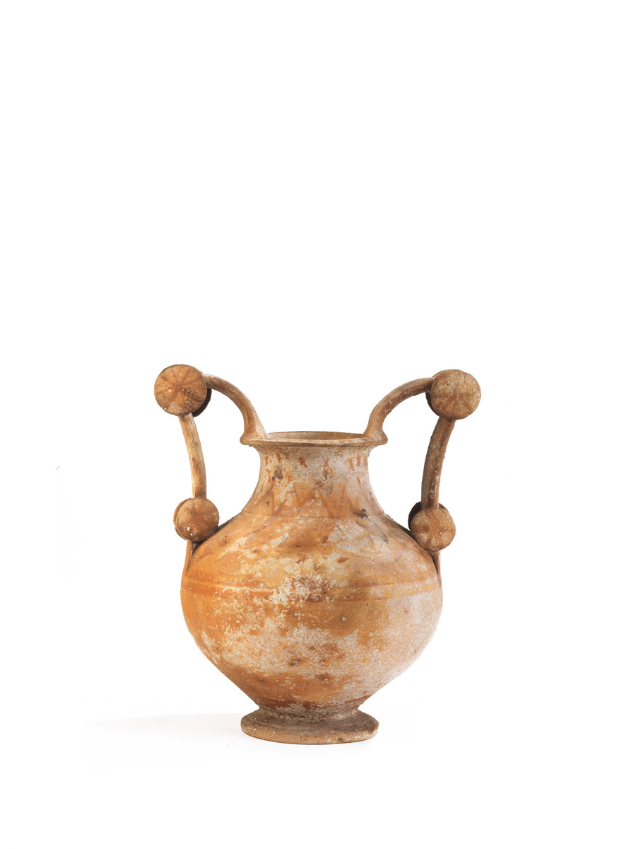 TROZZELLA MESSAPICA DATAZIONE: IV sec. a.C. MATERIA E TECNICA: argilla rosata, vernice bruna, modellata a tornio veloce Orlo estroflesso, con labbro arrotondato, collo troncoconico distinto dal corpo globulare schiacciato, piede troncoconico; alte anse a nastro, sormontanti e ripiegate, caratterizzate da coppie di dischi, impostate sul labbro e sulla spalla DECORAZIONE: sul labbro denti di lupo, collo linee oblique incrociate; sulla spalla tralcio di foglie d’edera cuoriformi, sulla massima espansione due fasce parallele orizzontali, su i dischi rosette PRODUZIONE: ceramica messapica STATO DI CONSERVAZIONE: integra DIMENSIONI: alt. cm 21,5