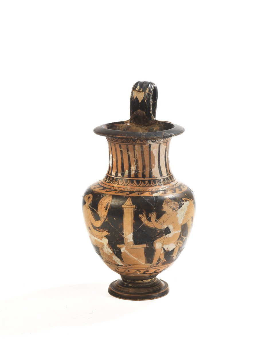 OLPE CAMPANA A FIGURE ROSSE DATAZIONE: IV sec. a.C. MATERIA E TECNICA: argilla figulina rosata, vernice nera lucente, modellata a tornio veloce Bocca rotonda con orlo appiattito, collo cilindrico a profilo concavo, distinto dal corpo ovoide, piede modanato, ansa a nastro costolato verticale impostata dall’orlo alla massima espansione DECORAZIONE: bocca ed ansa interamente verniciate, sul collo falsa baccellatura fra due fasce di ovoli; sulla spalla meandro ad onda destrorso e fila di punti a scacchiera; sotto l’ansa ampia palmetta aperta a ventaglio fra ricche girali fiorite e rosette, sotto la scena figurata meandro ad onda destrorso; ai lati della scena motivo sinuoso fra punti. Al centro una grande figura di Erote alato, androgino e nudo, volto a destra, seduto sul suo mantello con le ali chiuse sulla schiena e le braccia sollevate verso una stele posta al centro della scena. verso sinistra. Il giovane ha i capelli ricci, legati in uno chignon sulla nuca ed indossa i sandali; dall’altro lato della stele si trova una giovane donna seduta e volta a sinistra con un cembalo nella mano sinistra, una collana al collo ed un lungo filo di perle di traverso sul torace scoperto, mentre sulle gambe è drappeggiato il mantello. PRODUZIONE: ceramica campana, probabilmente Paestum STATO DI CONSERVAZIONE: ricomposta da frammenti con integrazioni DIMENSIONI: alt. cm 26