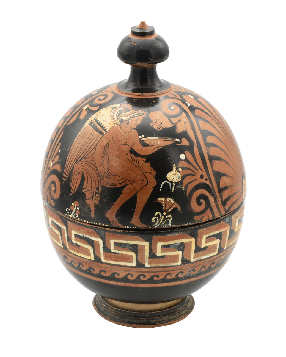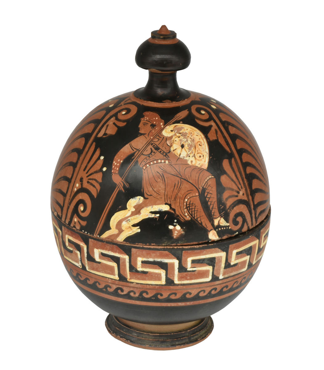 GRANDE LEKANIS GLOBULARE APULA DATAZIONE: ultimo venticinquennio del IV sec. a. C. MATERIA E TECNICA: argilla figulina beige, vernice nera lucente; suddipinture in bianco e giallo, modellata a tornio veloce Coperchio: pomello cilindrico con presa ad echino rovescio, tesa emisferica risega per l’incastro nella coppa Coppa: emisferica, piede troncoconico modanato con gola all’attacco con la vasca. DECORAZIONE: coperchio, lato A): amazzone seduta su un masso e volta a destra; la giovane donna indossa il costume frigio col caratteristico berretto, il chitone che lascia scoperto il seno destro, una cintura a balteo sul petto, lunghi pantaloni morbidi e sandali; nella mano destra impugna due lunghe lance e nella sinistra uno scudo circolare riccamente decorato; lato B) erote androgino nudo e con le grandi ali chiuse sulla schiena, seduto e volto a sinistra, con stephane radiata, capelli avvolti in un kekryphalos ricamato, orecchini circolari e filo di perle al collo; il giovane ha un mantello drappeggiato sulle gambe e tiene una phiale nella mano sinistra, nel campo una grande infiorescenza; fra i due lati grande palmetta aperta a ventaglio fra volute Coppa: sotto il bordo meandro continuo destrorso reso in prospettiva cui fa seguito un meandro ad onda destrorso; attacco col piede e interno del piede risparmiati PRODUZIONE: ceramica apula a figure rosse, cerchia del Pittore di Dario, Gruppo Paidagogos STATO DI CONSERVAZIONE: integra DIMENSIONI: alt. cm 23,5 PROVENIENZA: New Hermes Arte Antica, Arezzo CFR.: D.Trendall, A. Cambitoglou, The Red-figured Vases of Apulia II, Oxford 1982