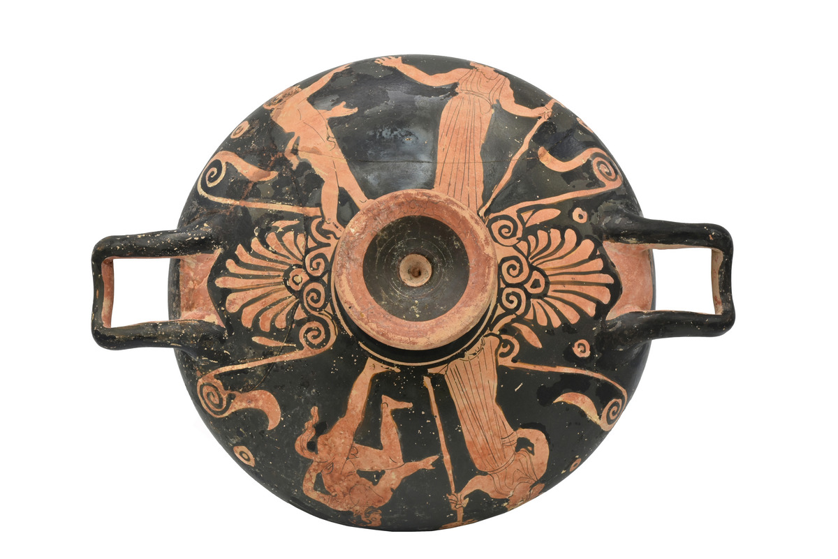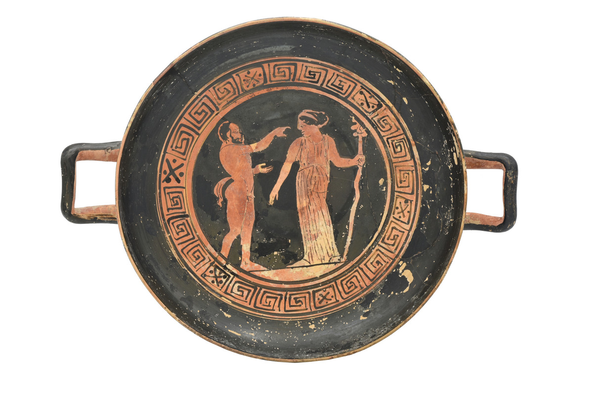 KYLIX ATTICA A FIGURE ROSSE DATAZIONE: metà V sec. a. C. MATERIA E TECNICA: argilla figulina arancio; vernice nera lucente, modellata a tornio veloce Kylix con orlo indistinto dalla vasca emisferica; anse a bastoncello impostate sulla massima espansione e ritorte verso l’alto; piede a tromba su stelo cilindrico DECORAZIONE ACCESSORIA: interamente verniciata eccetto l’interno delle anse; parte inferiore del piede risparmiata; sotto le anse grande palmetta aperta a ventaglio fra girali e volute DECORAZIONE: al centro della vasca, entro una cornice a meandro sinistrorso interrotto da motivo a croce di Sant’Andrea e punti si trovano a destra un satiro nudo e barbato, volto a sinistra con le braccia sollevate verso una menade stante di fronte a lui con un tirso nella mano sinistra; la giovane indossa un chitone plissettato lungo fino ai piedi; sull’ esterno da ogni lato scene di conversazione fra un satiro nudo ed una menade PRODUZIONE: attica a figure rosse STATO DI CONSERVAZIONE: ricomposta da frammenti, con piccole integrazioni DIMENSIONI: alt. cm 7; diam. cm 20 PROVENIENZA: Galleria Pechetau Badin, Parigi CFR.: J. Boardman Vasi ateniesi a figure rosse, Milano 1992