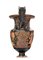 DECORAZIONE: lato A) sotto il labbro meandro ad onda destrorso, sul collo profilo femminile volto a sinistra con kekryphalos, stephane di perle, orecchini e collana che sorge da un fiore ed è circondato da grandi volute e infiorescenze; sul ventre naiskos in bianco con colonne ioniche sotto al quale si trova la figura del defunto, in nudità eroica, seduto a sinistra sul suo mantello, le gambe incrociate, in atto di appoggiarsi alla lancia e sostenere una phiale; alla sua sinistra una giovane donna riccamente abbigliata in atto di offrirgli un unguento contenuto nell’alabastron che sorregge nella mano sinistra mentre nella destra tiene un cembalo; dall’altro lato un giovane nudo volto verso il defunto col mantello drappeggiato sulla spalla e sul torace con strigile nella mano destra e corona nella sinistra; ai lati del podio due grandi patere; lato B) sotto al labbro motivo a chevron, sul collo meandro continuo destrorso e grande palmetta aperta a ventaglio fra volute; sul ventre stele funeraria su podio a cui è legata una tenia nera sormontata da un grande bacile; a sinistra giovane donna riccamente abbigliata con un grappolo d’uva nella mano destra ed un cista e una tenia nella sinistra; dall’altro lato un giovane nudo con mantello drappeggiato sul braccio sinistro che sorregge una phiale mentre nella destra tiene uno specchio e una tenia