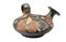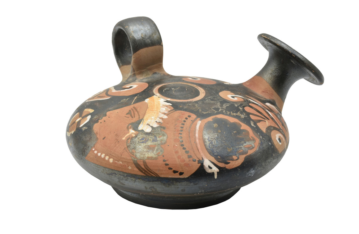 GUTTUS APULO A FIGURE ROSSE DATAZIONE: ultimo quarto del IV sec. a. C MATERIA E TECNICA: argilla camoscio, vernice nera lucente, suddipinture in bianco e giallo, coloritura rosso arancio, modellata a tornio veloce Guttus di forma lenticolare schiacciata con piccola apofisi al centro; piede ad anello, ansa a nastro impostata verticalmente sulla spalla, bocchello campanulato con breve collo cilindrico a profilo concavo DECORAZIONE: interamente verniciato in nero ad eccezione dell’attacco dell’ansa e del bocchello; sulla spalla profilo femminile volto a destra con stephane radiata, orecchini con pendenti e filo di perle; la donna porta i capelli raccolti nel kekryphalos ricamato e fermato da una tenia, dal quale fuoriesce un vaporoso ciuffo di capelli; nel campo rosette e volute vegetali PRODUZIONE: ceramica apula a figure rosse STATO DI CONSERVAZIONE: integro DIMENSIONI: alt. cm 8, diam. cm 15 PROVENIENZA: Casa d’aste L’Anglicana, Roma CFR: A.D. Trendall, A. Cambitoglou The Red-figured Vases of Apulia II, London 1991