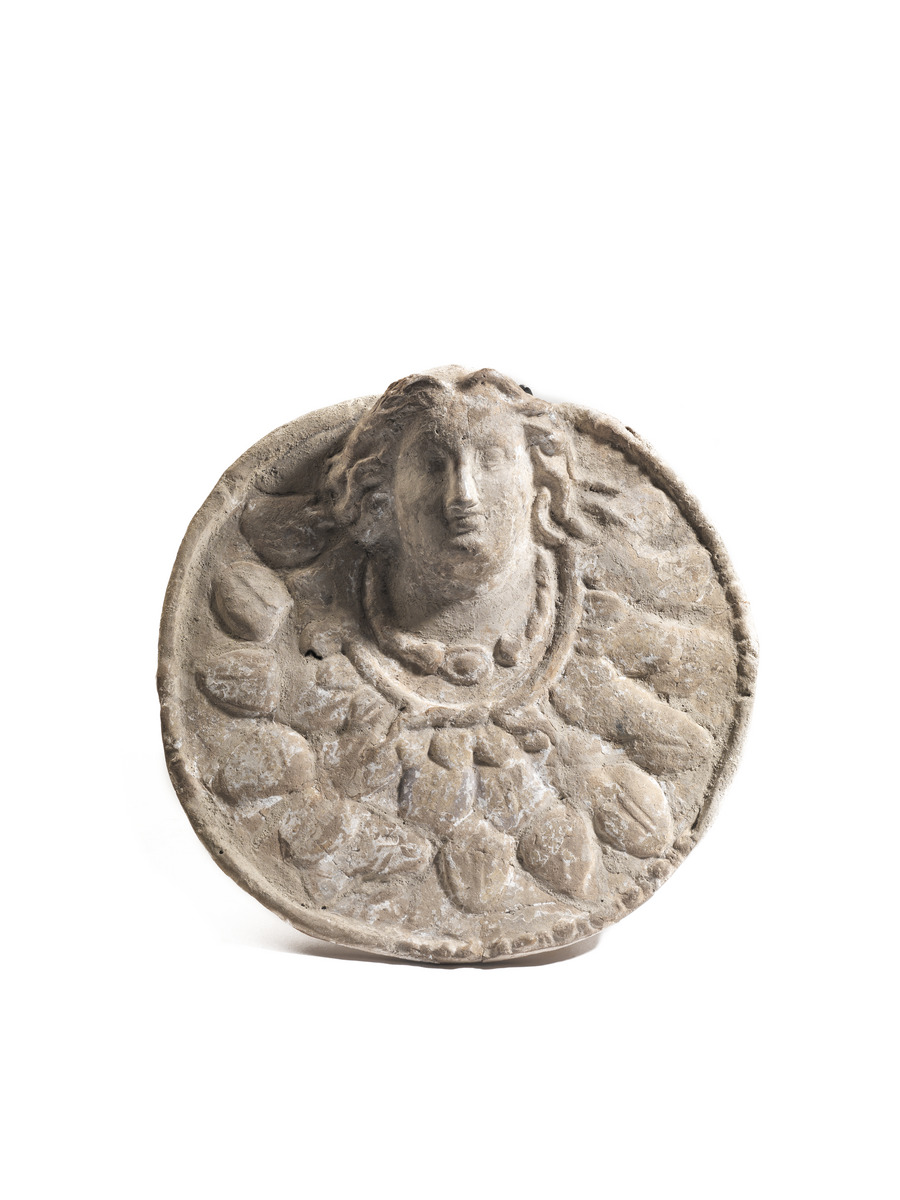 OSCILLUM DATAZIONE: IV-III sec. a.C. MATERIA E TECNICA: argilla nocciola; ingubbiatura bianca; vernice bianca e rossa, modellato a stampo Testa femminile con capelli scompartiti al centro in lunghe ciocche fluenti che ricadono ai lati del volto, al collo porta un torque ritorto ed è inquadrata da una ghirlanda di foglie stilizzate PRODUZIONE: ceramica magno greca STATO DI CONSERVAZIONE: ricomposto da frammenti DIMENSIONI: diam. cm 19,5