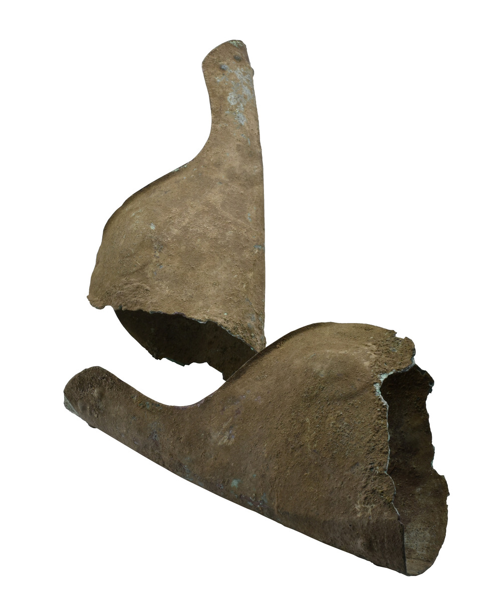 RARA COPPIA DI SCHINIERI IN BRONZO DATAZIONE: VI sec. a.C. MATERIA E TECNICA: bronzo laminato e cesellato Coppia di schinieri, destro e sinistro, modellati anatomicamente con indicazione del ginocchio, della tibia, dei muscoli del polpaccio; foro passante nella parte posteriore per la chiusura PRODUZIONE: cultura etrusca STATO DI CONSERVAZIONE: integri, incrostati DIMENSIONI: alt. cm 28 CFR.: Etrusker in der Toskana, Firenze 1987, p 59, n 29