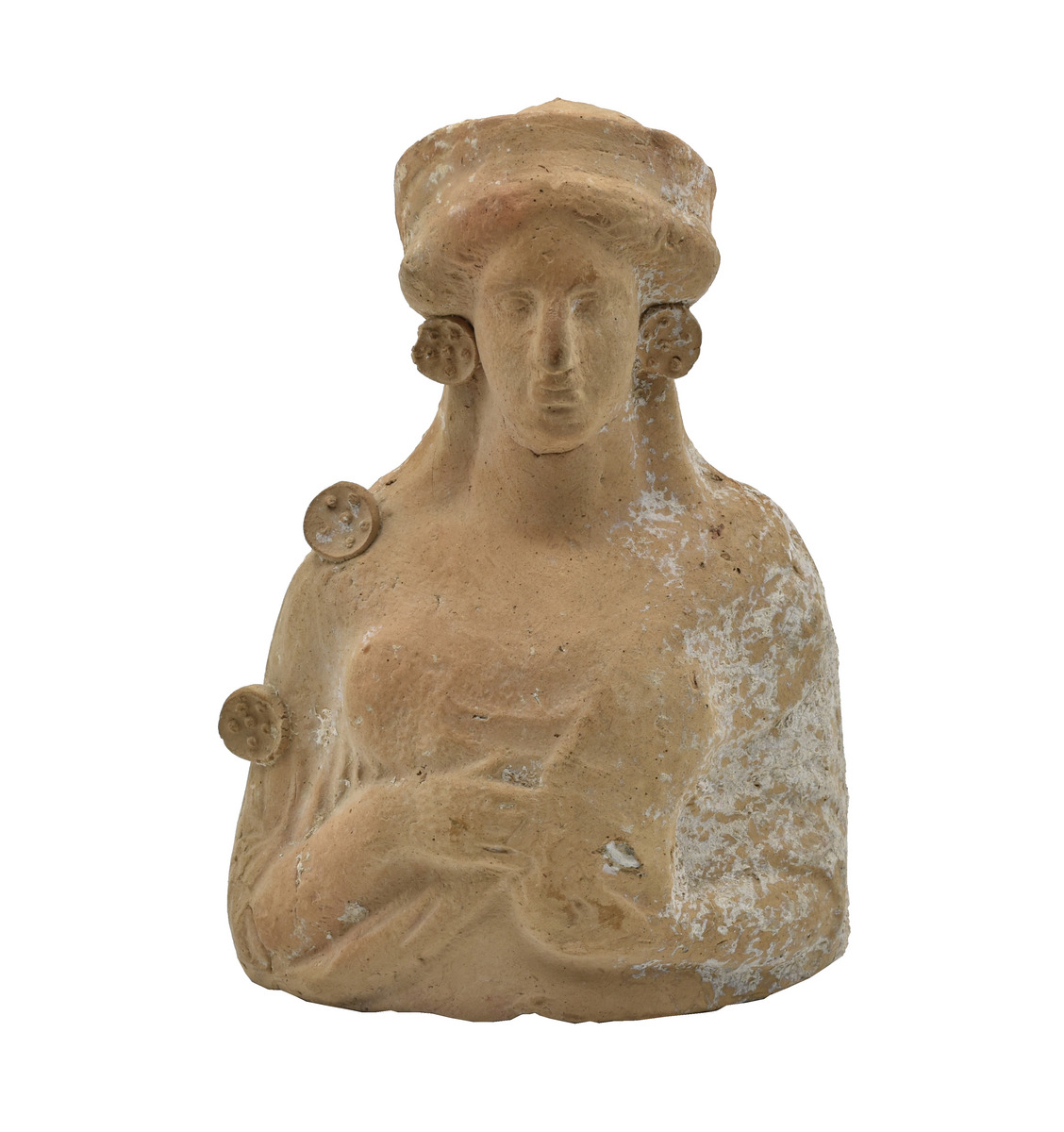 BUSTO VOTIVO DATAZIONE: IV sec. a. C. MATERIA E TECNICA: impasto depurato rosato, ingubbiatura biancastra; modellata a stampo con ritocchi a stecca, interno cavo Busto femminile stante in posizione frontale con la testa volta a sinistra con le mani conserte sul petto; la donna porta un’elaborata acconciatura dei capelli; grandi orecchini circolari traforati en pendant con la fibula che ferma il mantello sulla spalla PRODUZIONE: ceramica greca, Tebe STATO DI CONSERVAZIONE: integra, superficie consunta DIMENSIONI: alt. cm 15 PROVENIENZA: Galleria Drouot, Parigi