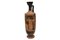 LEKYTHOS ATTICA A FIGURE ROSSE DATAZIONE: fine V SEC. A.C. MATERIA E TECNICA: argilla figulina arancio, vernice nera lucente con riflessi metallici, modellata a tornio veloce Bocchello di forma troncoconica rovescia, sottile collo cilindrico a profilo concavo, distinto dalla spalla appiattita, corpo ovoide rastremato verso il basso; ansa a nastro impostata verticalmente dal collo alla spalla, piede a disco DECORAZIONE ACCESSORIA: bocchello e esterno dell’ansa verniciati, alla base del collo kyma ionico, sulla spalla decorazione a eleganti palmette aperte a ventaglio alternativamente rivolte in alto e in basso, fra girali; parte inferiore del corpo e superiore del piede verniciate; sopra e sotto la scena figurata motivo a meandro continuo sinistrorso, orlo e parte inferiore del piede risparmiati DECORAZIONE: scena d‘interno: a sinistra un uomo anziano, barbato e calvo, assiso su uno scranno e completamente avvolto nel mantello, un bastone nella mano sinistra, solleva la destra verso una giovane donna in piedi di fronte a lui col braccio destro sollevato mentre nell’altro sostiene una cista; la giovane è avvolta nel mantello sotto al quale porta il chitone plissettato lungo fino ai piedi PRODUZIONE: ceramica attica a figure rosse STATO DI CONSERVAZIONE: integralmente ricomposta da frammenti DIMENSIONI: alt. cm 37 PROVENIENZA: Gea Arte Antica, Roma