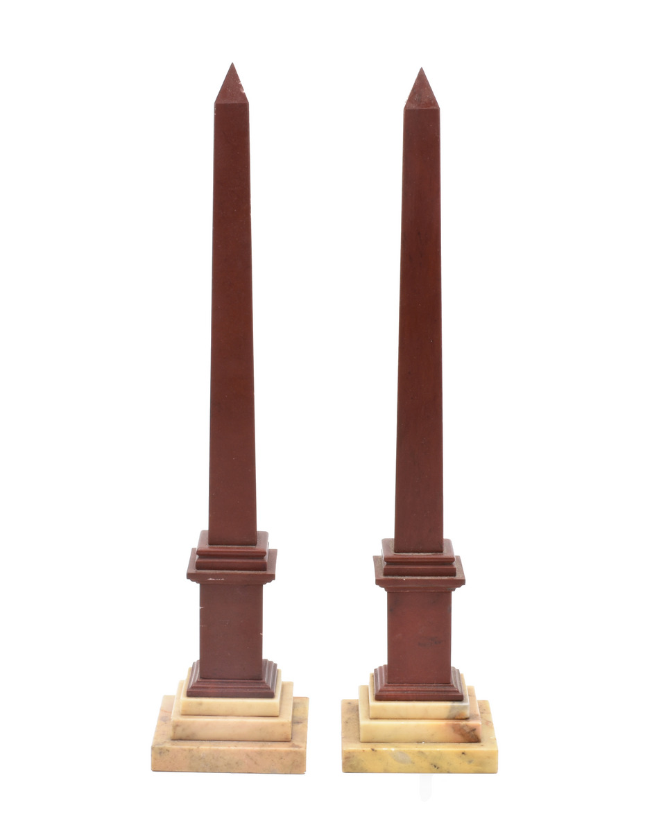 COPPIA DI OBELISCHI in marmo rosso antico su basamento quadrangolare e tre gradini in marmo bianco, alt. cm 27,5