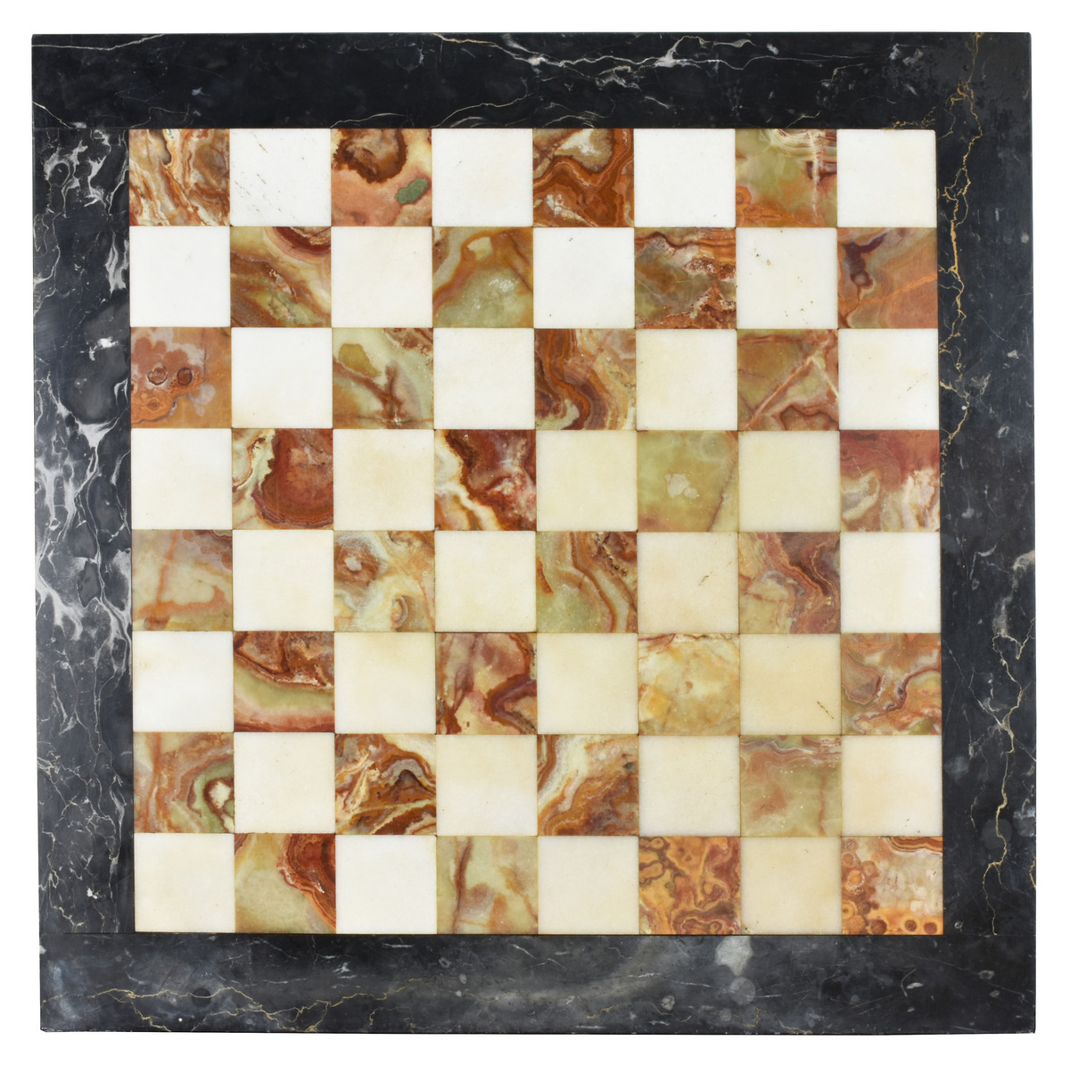 TAVOLINO SCACCHIERA in marmo bianco e onice sultano, con bordo in marmo nero;...
