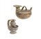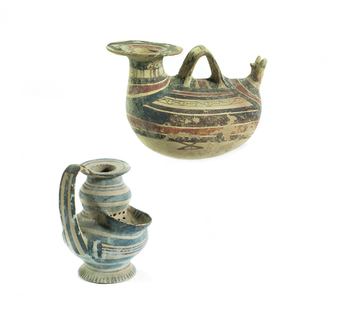 ASKOS E BROCCHETTA-FILTRO DAUNI Forma V, tipo 9, De Juliis 1977 DATAZIONE: Subgeometrico Daunio II, 550-400 a.C. MATERIA E TECNICA: argilla depurata camoscio, ingubbiatura avorio; vernice bruna e paonazza; modellati a mano e a tornio lento Askos con ampio bocchello a tesa appiattita, collo troncoconico, corpo globulare schiacciato, ansa a nastro impostata longitudinalmente sul dorso, all’estremità opposta al bocchello protome ferina stilizzata; fondo piatto; sul bocchello archi di cerchio tangenti l’imboccatura, sul collo motivo geometrico e filetti verticali, sul ventre fasce alternate in bruno e paonazzo e motivi geometrici; brocchetta-filtro con orlo a tesa, collo ovoide, corpo globulare schiacciato, con versatoio sulla massima espansione dotato di filtro, piede troncoconico, ansa a nastro impostata verticalmente dall’orlo alla spalla, decorata a fasce alternate in bruno e paonazzo (2) PRODUZIONE: ceramica subgeometrica daunia STATO DI CONSERVAZIONE: integro, lieve lacuna sul bocchello DIMENSIONI: alt. cm 14 e cm 14,5 CFR.: E. M. De Juliis La ceramica geometrica della Daunia. Firenze 1977.