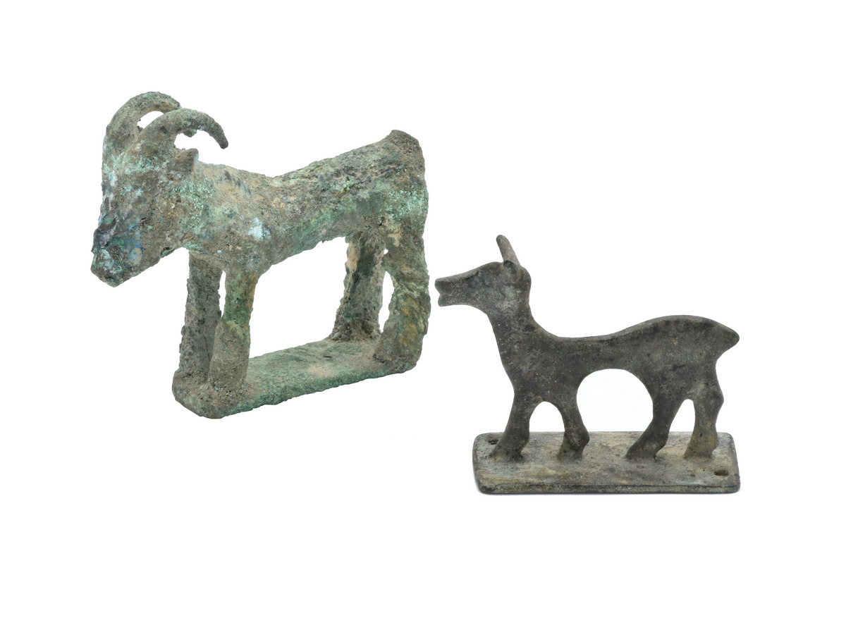 DUE STATUETTE DATAZIONE: IX-VII sec. a.C MATERIA E TECNICA: bronzo fuso, rifinito a cesello Statuetta modellata a capride stilizzato in posizione eretta su base rettangolare con corna arcuate rivolte all’indietro, e altra raffigurante bovide gradiente su base rettangolare fortemente stilizzata (2) PRODUZIONE: cultura del Luristan STATO DI CONSERVAZIONE: integre, ossidate DIMENSIONI: alt. cm 4 e cm 5,8 PROVENIENZA: Casa d’aste Pandolfini Firenze