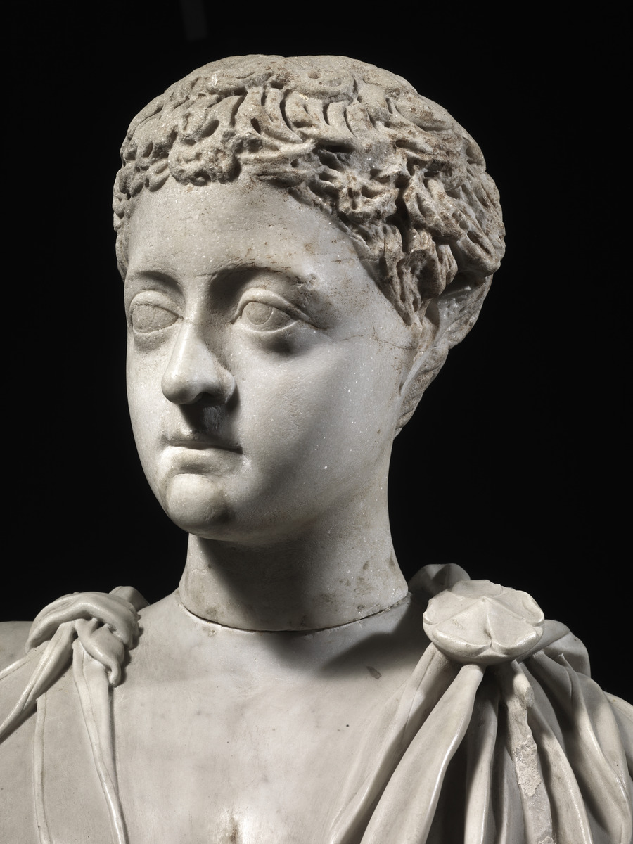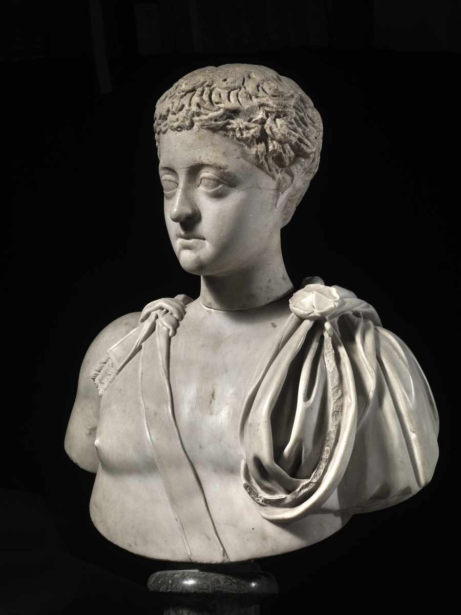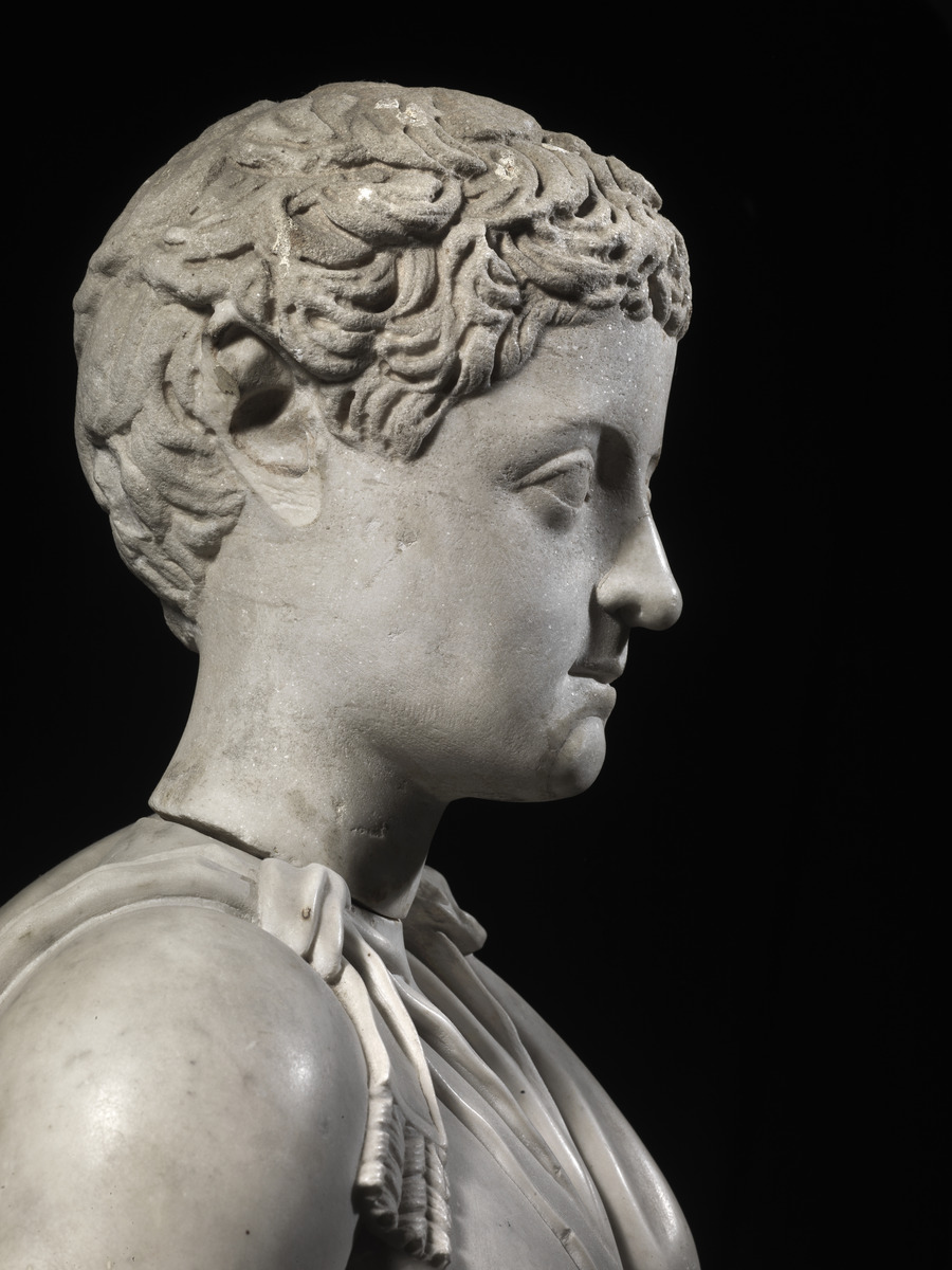 BUSTO DI COMMODO GIOVANE DATAZIONE: 175-177 d. C. MATERIA E TECNICA: marmo bianco italico a grana media, scolpito, levigato e rifinito a trapano Commodo è raffigurato ancora bambino, leggermente volto a destra, con una capigliatura a folte ciocche scomposte e sovrapposte che ricadono ai lati del viso, la fronte è ampia, le arcate sopracciliari chiaroscurate, la palpebra è appena abbassata, gli occhi allungati sono delineati con indicazione sia della pupilla che dell’iride e anche del dotto lacrimale; gli zigomi sono appena rilevati e le guance paffute come si addice ad un fanciullo, la bocca è piccola e semidischiusa, il mento tondeggiante. Il bambino ha un’aria assorta e per certi versi mostra un’espressione quasi sorpresa. Il ritratto mostra la ricercatezza delle volumetrie caratteristica dell’arte antonina, i contrasti fra la chiara levigatezza delle carni, il graffito delle sopracciglia, degli occhi, e la massa articolata della chioma, profondamente lavorata dal trapano. La testa è inserita in un busto di epoca successiva con torace nudo su cui è drappeggiato il paludamentum fermato sulla spalla sinistra da una bulla e da un cingulum sulla destra L’iconografia di Commodo (L. Aelius Aurelius Commodus Antoninus, 161-192 d. C.) è ben conosciuta e studiata; questo ritratto rientra nel cosiddetto primo tipo iconografico, noto circa da dieci repliche delle quali la migliore è quella conservata ai Musei Capitolini a Roma nella Sala degli Imperatori n. inv. MC 0454 Il nostro ritratto lo raffigura probabilmente intorno ai sedici anni quando fu proclamato Augusto dal padre Marco Aurelio e gli fu anche conferita la tribunicia potestas e quindi consacrato come erede al trono PRODUZIONE: cultura romana imperiale STATO DI CONSERVAZIONE: restauri antichi sul naso e sul mento, superficie abrasa, busto paludato di epoca successiva DIMENSIONI: alt. complessiva cm 54; testa altezza cm 22,5 CFR.: M. Bergmann Gli imperatori e le stilizzazioni delle loro immagini in: L’età dell’angoscia. Da Commodo a Diocleziano, 180-305 d.C. Roma 2015, pp 74-83 Completa di base in marmo verde di Prato Dichiarato di interesse archeologico particolarmente importante ai sensi del D.Lgs 42/2004 con D.M n. 39856 del 25 Febbraio 1984