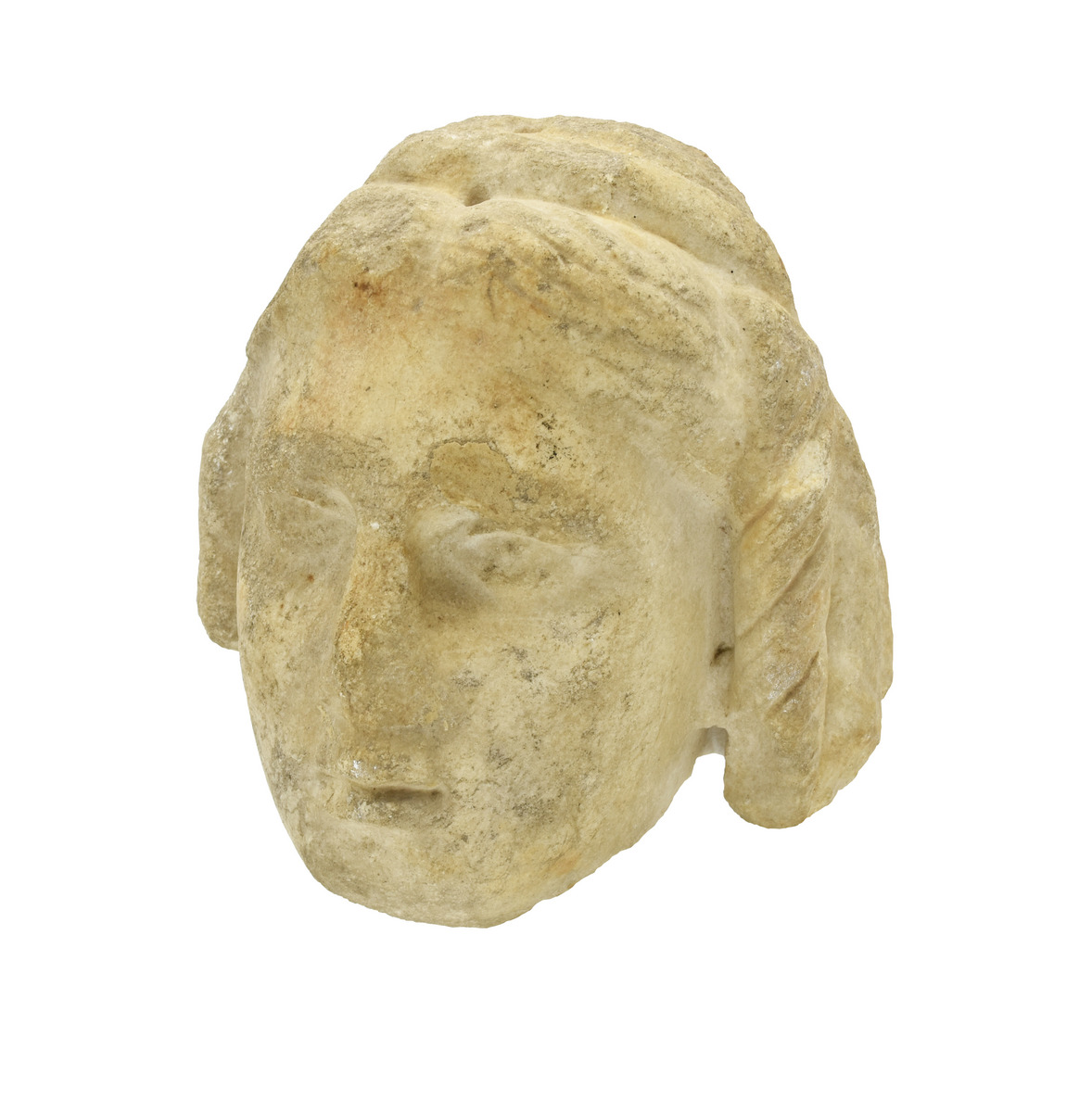 REGINA LAGIDE DATAZIONE: II-I sec. a. C. MATERIA E TECNICA: marmo bianco a grana media, scolpito e levigato Testa femminile con capelli compartiti sulla fronte e pettinati in larghe bande che ricadono sulle orecchie e sulla nuca e sono trattenuti da una tenia; il volto ha fronte alta, grandi occhi amigdaloidi con l’indicazione delle palpebre e delle pupille, naso arrotondato, zigomi appena rilevati, bocca con labbra carnose e semiaperte PRODUZIONE: cultura egiziana tardo ellenistica, Alessandria STATO DI CONSERVAZIONE: scheggiature diffuse DIMENSIONI: alt. cm 16 PROVENIENZA: Casa d’aste Tajan, Parigi