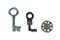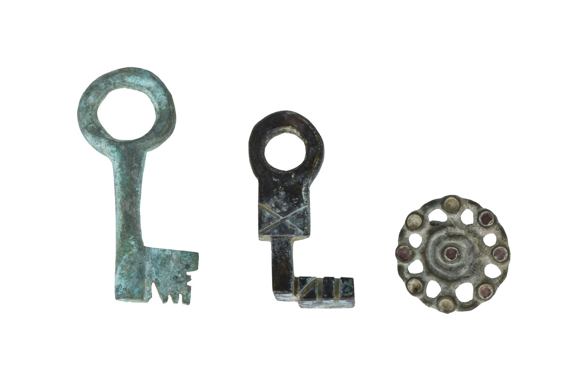DUE CHIAVI E UNA FIBULA DATAZIONE: V-VII sec. d.C MATERIA E TECNICA: bronzo fuso, rifinito a cesello, pasta vitrea Fibula circolare con nove castoni in pasta vitrea rossa ad imitazione di un fiore e due piccole chiavi, una romana ed una di epoca posteriore (3) PRODUZIONE: cultura romana imperiale STATO DI CONSERVAZIONE: integre, ossidate PROVENIENZA: Casa d’aste Pandolfini Firenze