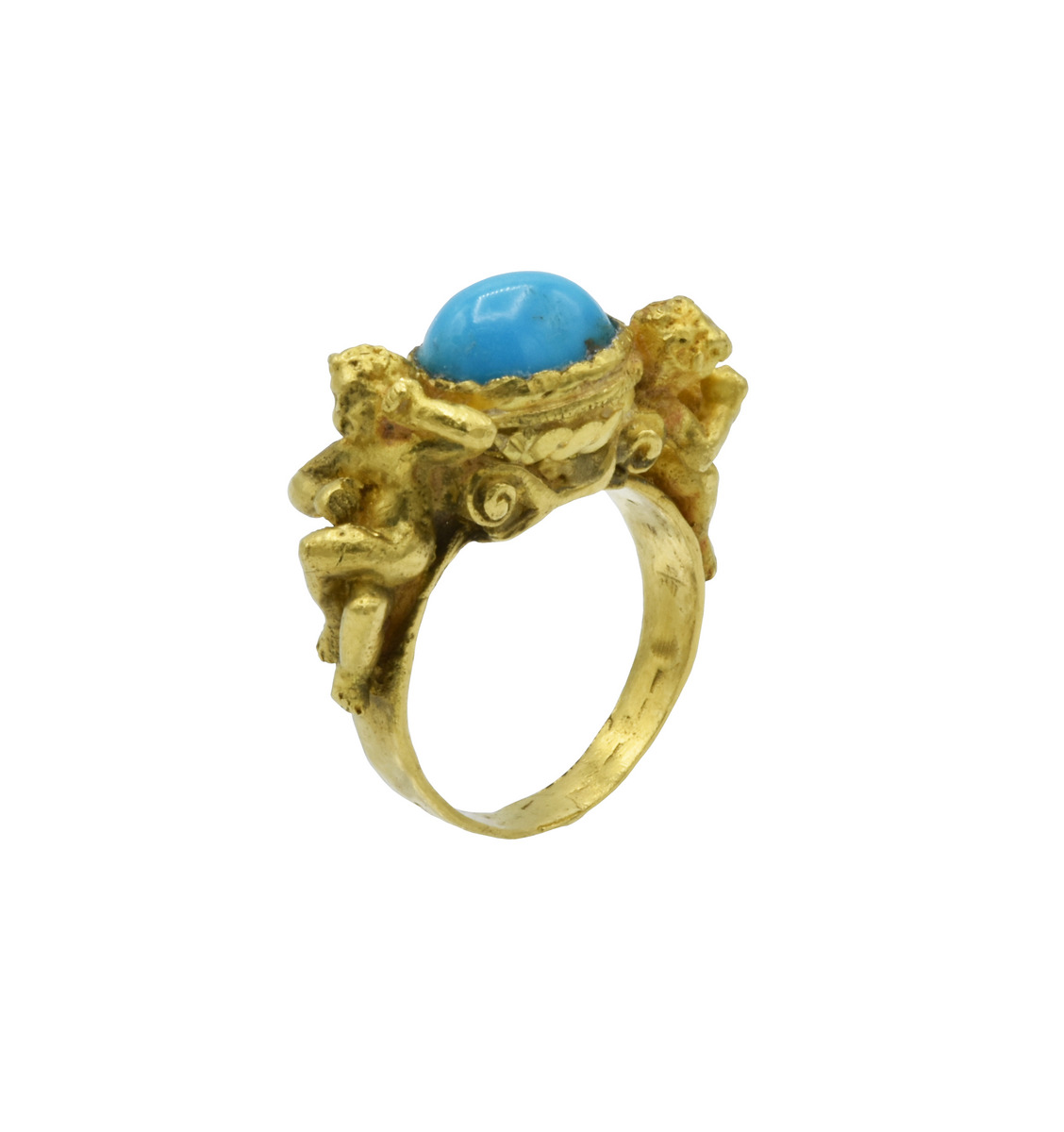 ANELLO IN ORO E TURCHESE DATAZIONE: XIX sec MATERIA E TECNICA: oro fuso e cesellato, turchese Anello con castone ovale in forma di un piccolo capitello ionico con una turchese cabochon a cui si appoggiano due puttini nudi STATO DI CONSERVAZIONE: integro PESO: g 16,5. Datazione: XIX sec.