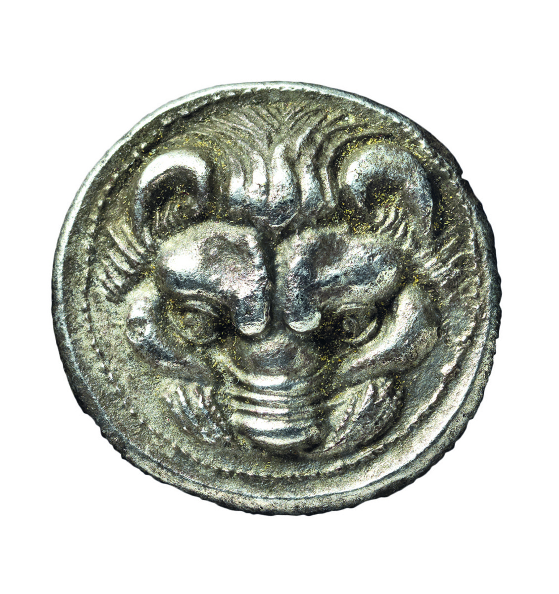 BRUTTIUM TETRADRACMA REGGIO DATAZIONE: 415-387 a. C. MATERIA E TECNICA: argento coniato D: testa di leone frontale accuratamente delineata, entro cornice perlinata R: testa laureata di Apollo giovinetto a destra; a sinistra ramoscello d’olivo; iscrizione RHGINON PRODUZIONE: cultura magno greca STATO DI CONSERVAZIONE: splendido DIMENSIONI: diam mm 24, peso gr. 16,12 PROVENIENZA: Solidus Numismatik e. K., Mu¨nchen