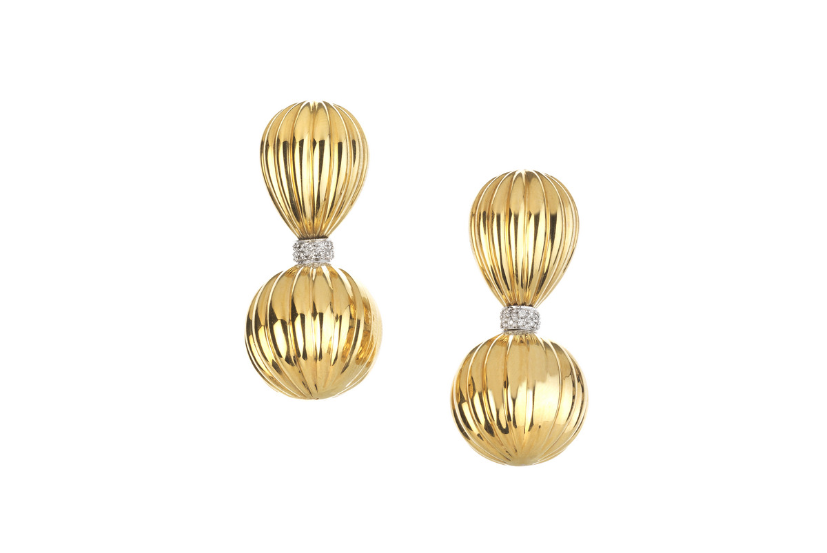 PAIO DI ORECCHINI PENDENTI IN ORO GIALLO E DIAMANTI realizzati con un elemento a goccia ed uno a sfera in oro giallo bombato e scanalato, al centro un anello in oro bianco decorato in pavé di diamanti, punzone 750, lungh. cm 5 PAIR OF YELLOW GOLD AND DIAMOND PENDANT EARRINGS