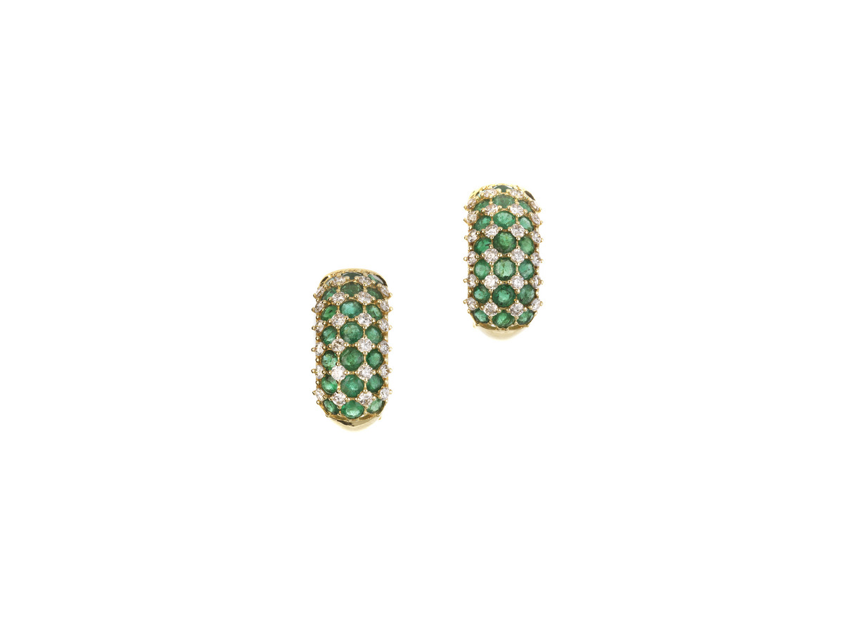 PAIO DI ORECCHINI IN ORO GIALLO, SMERALDI E DIAMANTI a semicerchio bombato...