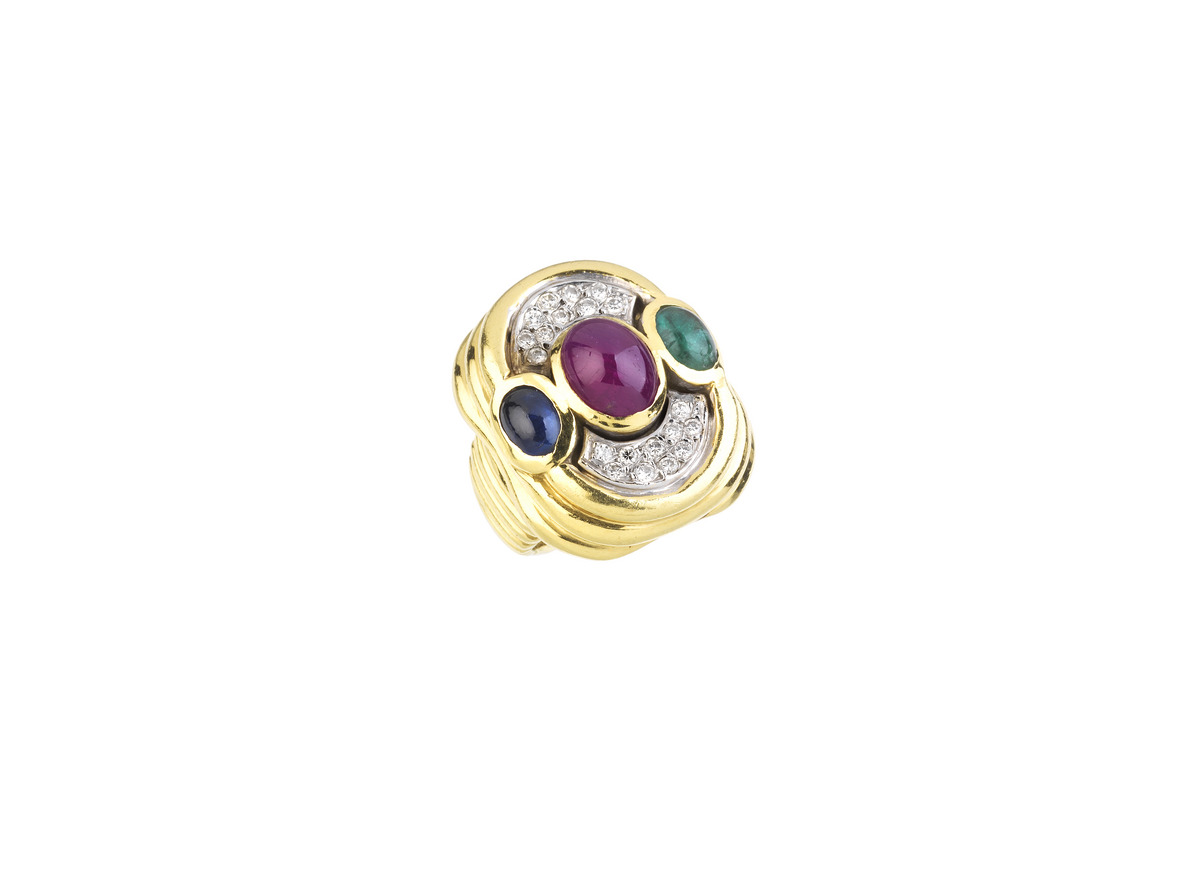 ANELLO IN ORO GIALLO, ZAFFIRO, RUBINO, SMERALDO E DIAMANTI realizzato in oro...