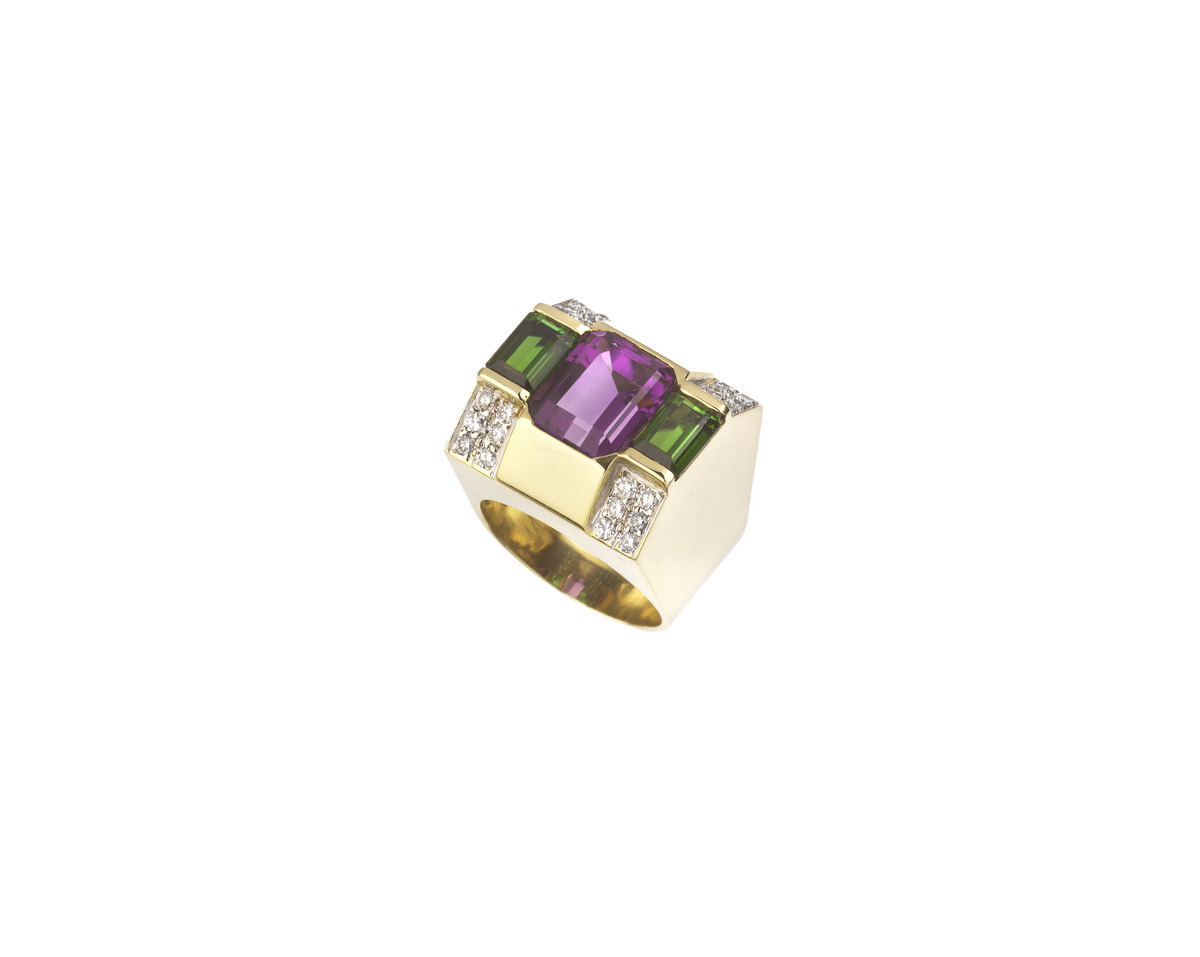 2018/0177-013 ANELLO IN ORO GIALLO 14 K, AMETISTA, TORMALINA VERDE E DIAMANTI...