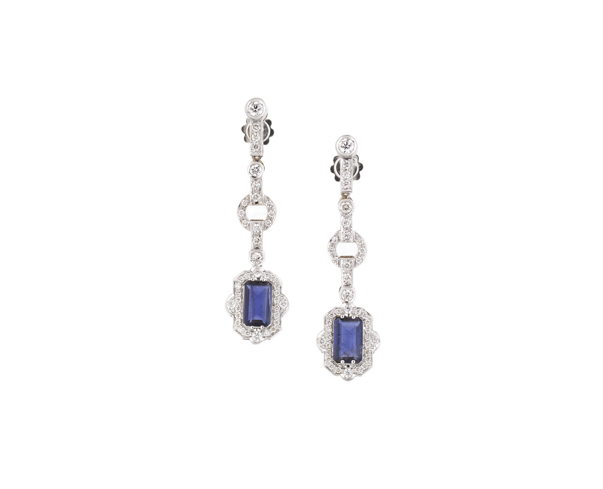 PAIO DI ORECCHINI PENDENTI IN ORO BIANCO, TANZANITE E DIAMANTI ad una linea...