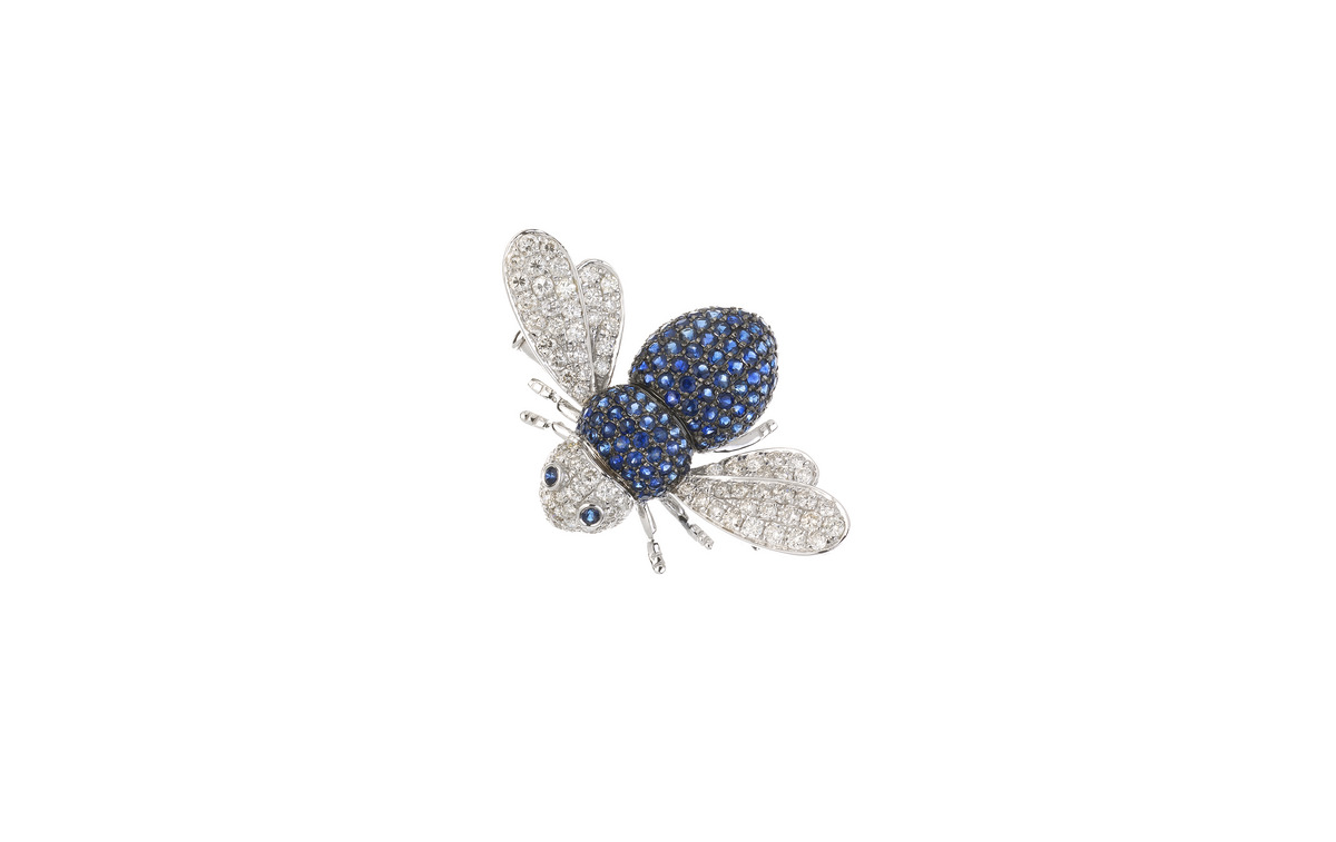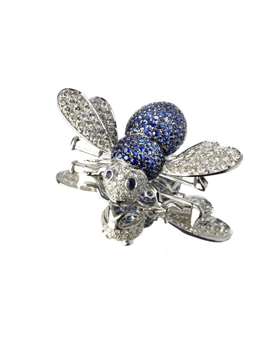 SPILLA IN ORO BIANCO, DIAMANTI E ZAFFIRI modellata ad ape, il corpo decorato...