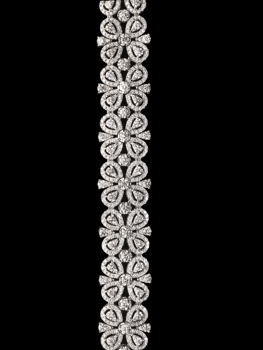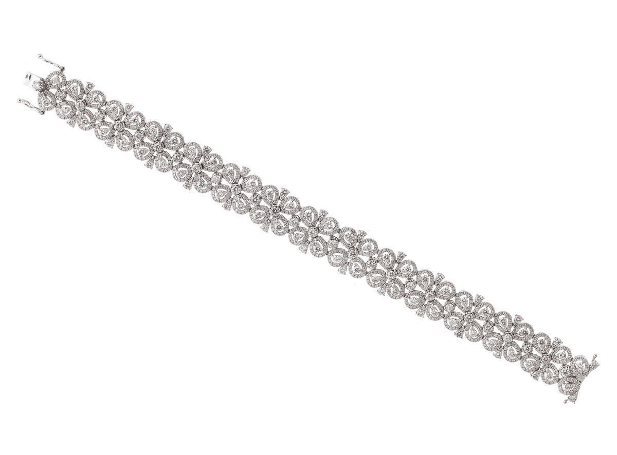 BRACCIALE IN ORO BIANCO E DIAMANTI realizzato come un nastro a maglia flessibile formato da una linea di corolle quadrilobate in diamanti taglio brillante rotondo per 5.20 circa, punzone 750, lungh. cm 16,5 DIAMOND AND WHITE GOLD BRACELET