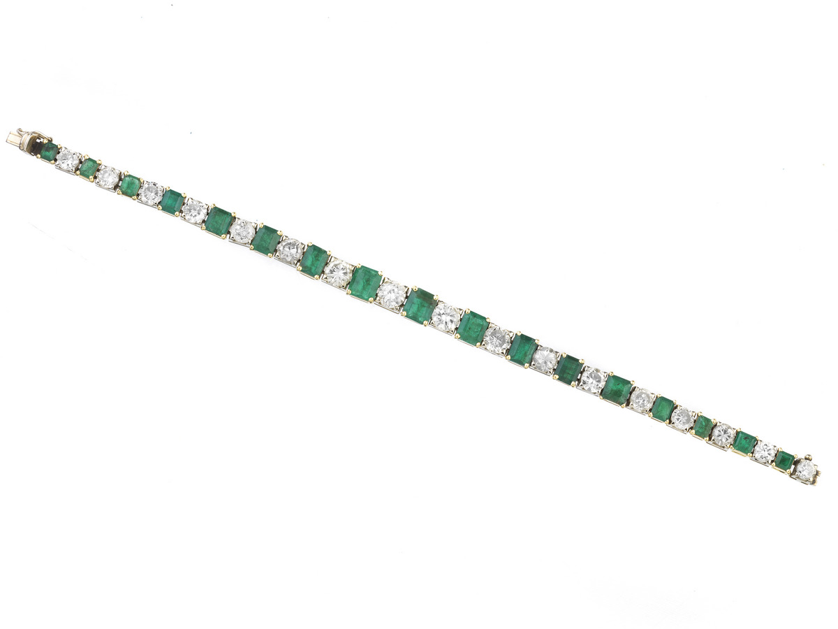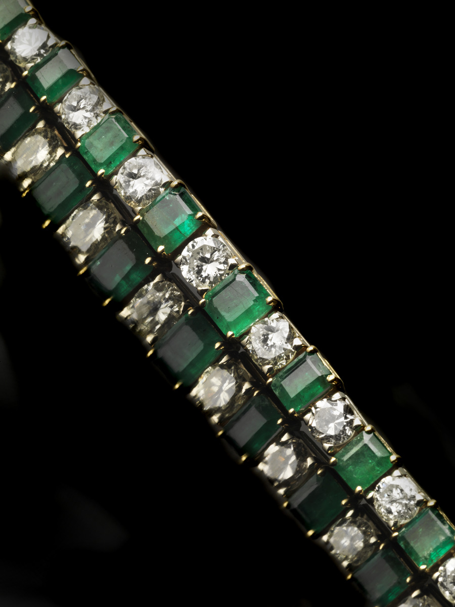 BRACCIALE IN ORO GIALLO, ORO BIANCO, DIAMANTI E SMERALDI ad una linea di diamanti taglio brillante rotondo per ct 8.50 circa e smeraldi taglio ottagonale per ct 9.50 circa posti in gradazione entro castoni rispettivamente in oro bianco ed oro giallo, lungh. cm 17,5 DIAMOND, EMERALD, WHITE AND YELLOW GOLD BRACELET