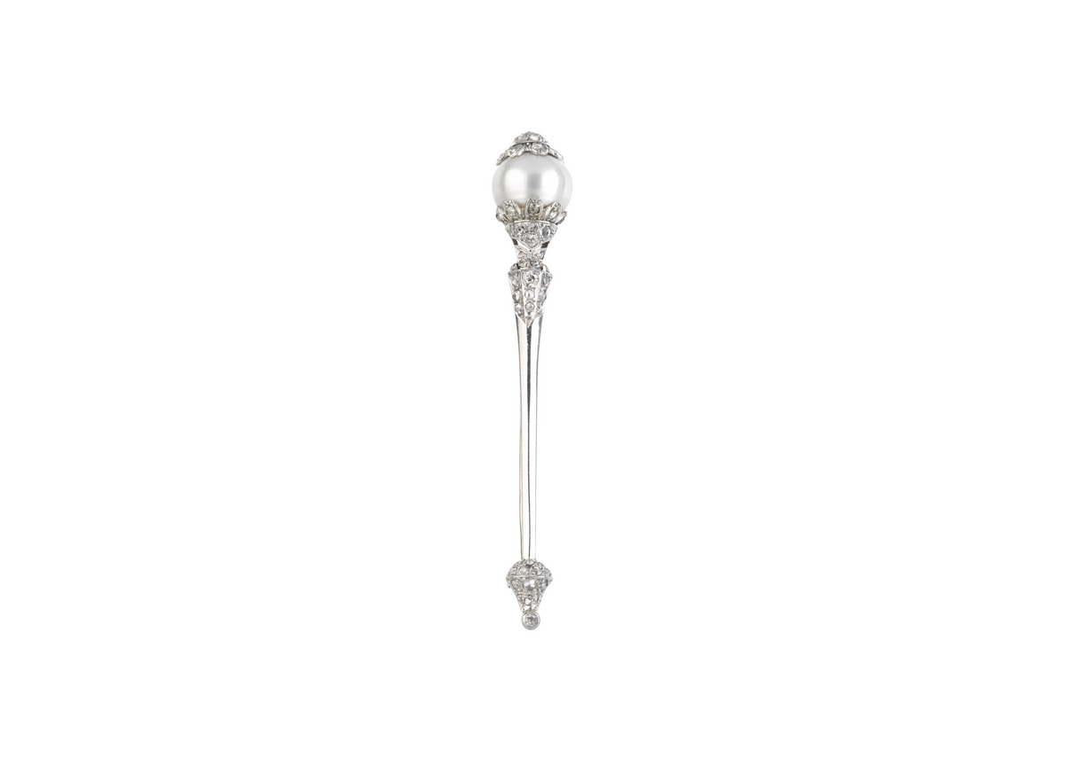 SPILLA IN ORO A BASSO TITOLO, PERLA NATURALE E DIAMANTI disegnata come una...