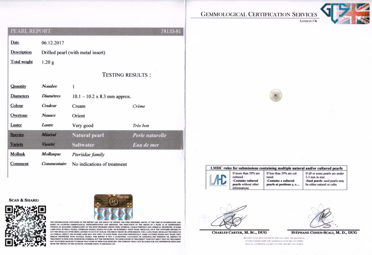 SPILLA IN ORO A BASSO TITOLO, PERLA NATURALE E DIAMANTI disegnata come una barretta in oro bianco 10k, le estremità in oro sagomato e traforato decorate in diamanti ed una perla naturale dim. mm 10,1-10,2x8,3 entro doppia corolla, lungh. cm 6,3 corredata di certificato GCS n. 78133-81 datato 12/2017 NATURAL PEARL, DIAMOND AND 10 K WHITE GOLD BAR BROOCH