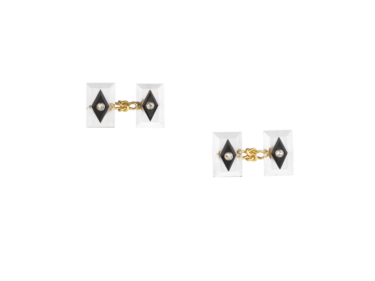 PAIO DI GEMELLI, PERIODO DÉCO, IN CRISTALLO DI ROCCA, ONICE, DIAMANTI E ORO GIALLO ciascuno formato da una coppia di elementi rettangolari sfaccettati in cristallo di rocca al centro dei quali è applicata un’onice romboidale decorata da un diamante taglio brillante rotondo, catenella di congiunzione in oro, entro astuccio d’epoca PAIR OF DÉCO ROCK CRYSTAL, ONYX, DIAMOND AND YELLOW GOLD CUFFLINKS