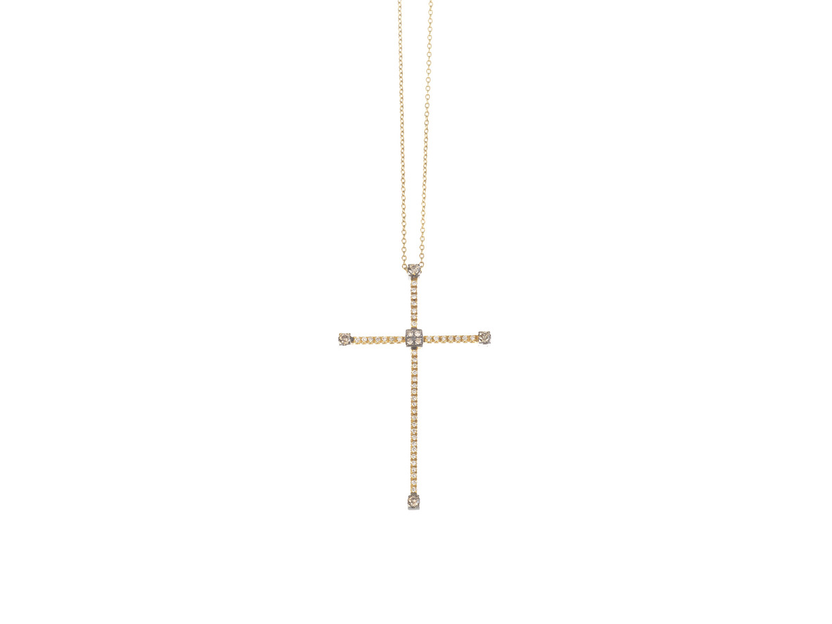 CROCE PENDENTE IN ORO ROSA, ORO BRUNITO, DIAMANTI INCOLORI E BROWN i bracci...