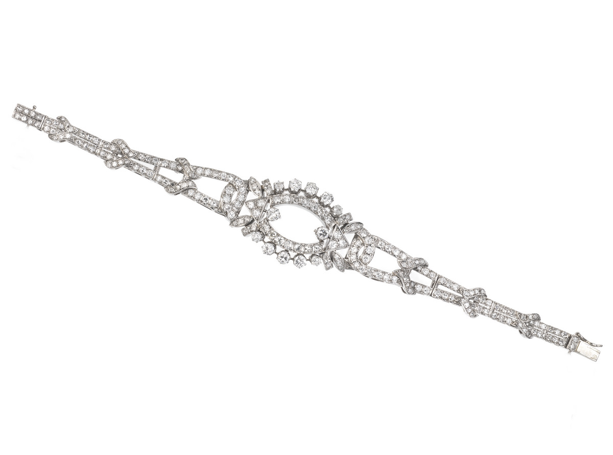 BRACCIALE IN ORO BIANCO E DIAMANTI disegnato come un nastro in oro sagomato e traforato ed elemento centrale a corolla di forma ovale decorati in diamanti taglio huit-huit, vecchio e brillante rotondo per ct 7.50 circa, punzone R. Torres, lungh. cm 18,3 DIAMOND AND WHITE GOLD BRACELET
