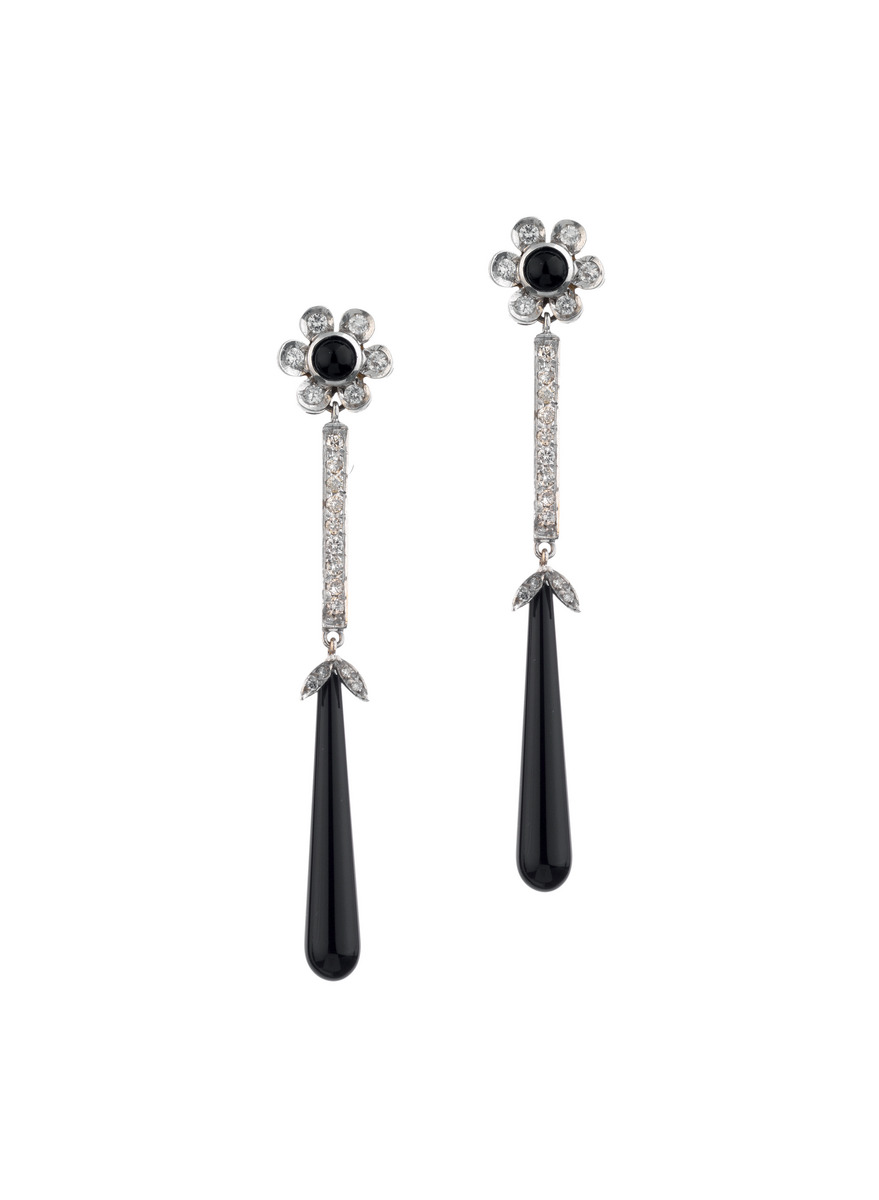 PAIO DI ORECCHINI PENDENTI IN ORO BIANCO, DIAMANTI E ONICE realizzati con un motivo a fiore a lobo ed un elemento a barretta decorati in diamanti, il pendente in onice a goccia, lungh. cm 7,5 PAIR OF WHITE GOLD, DIAMOND AND ONYX PENDANT EARRINGS