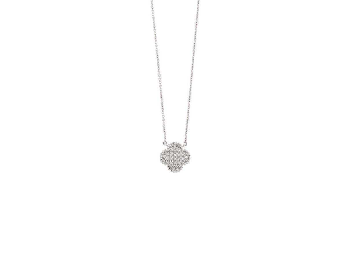 GIROCOLLO IN ORO BIANCO E DIAMANTI realizzato con una catena a maglia sottile al centro della quale è sospesa una corolla quadrilobata decorata in pavé di diamanti e profilata da un motivo perlinato, diam. cm 1,1, lungh. cm 42 DIAMOND AND WHITE GOLD PENDANT