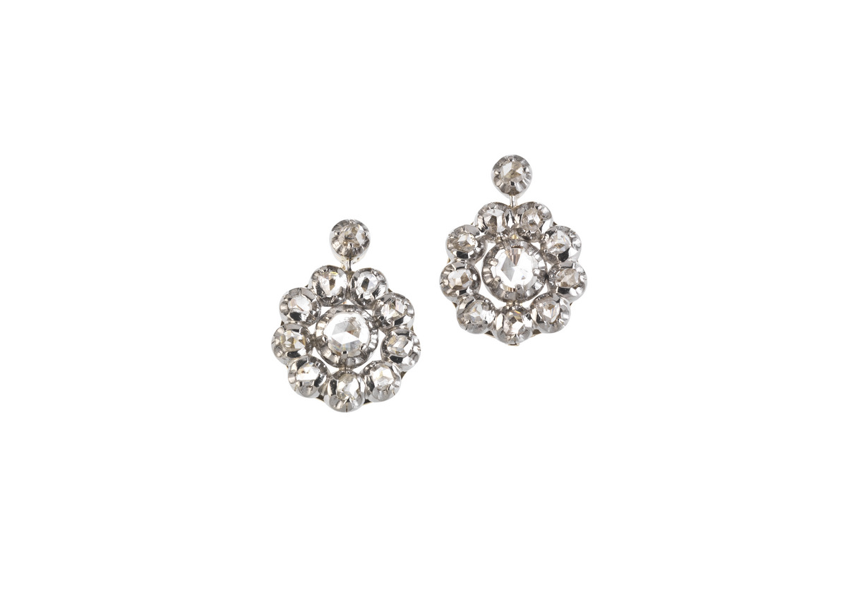 PAIO DI ORECCHINI IN ARGENTO, ORO GIALLO E DIAMANTI disegnati come un motivo a corolla in argento traforato foderato in oro e decorato in diamanti taglio rosa per ct 1.00 circa, lungh. cm 2 PAIR OF DIAMOND, SILVER AND YELLOW GOLD EARRINGS
