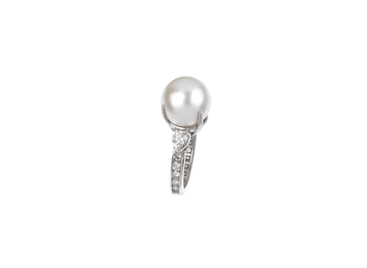 ANELLO IN PLATINO, DIAMANTI E PERLA il gambo decorato ad una linea di brillanti, al centro una perla diam. mm 12,3 entro castone a griffes affiancata da due diamanti per complessivi ct 1.00 circa, mis. 13 DIAMOND, PEARL AND PLATINUM RING