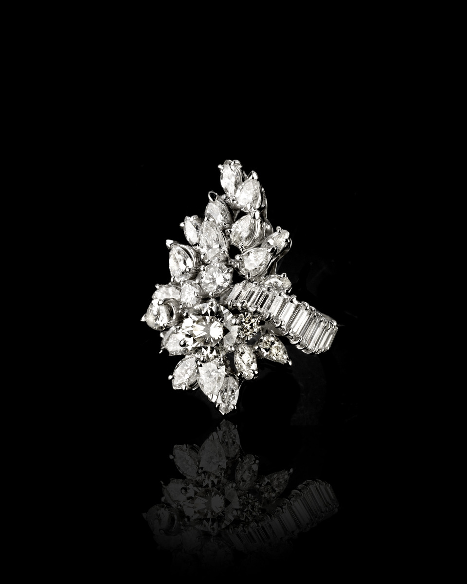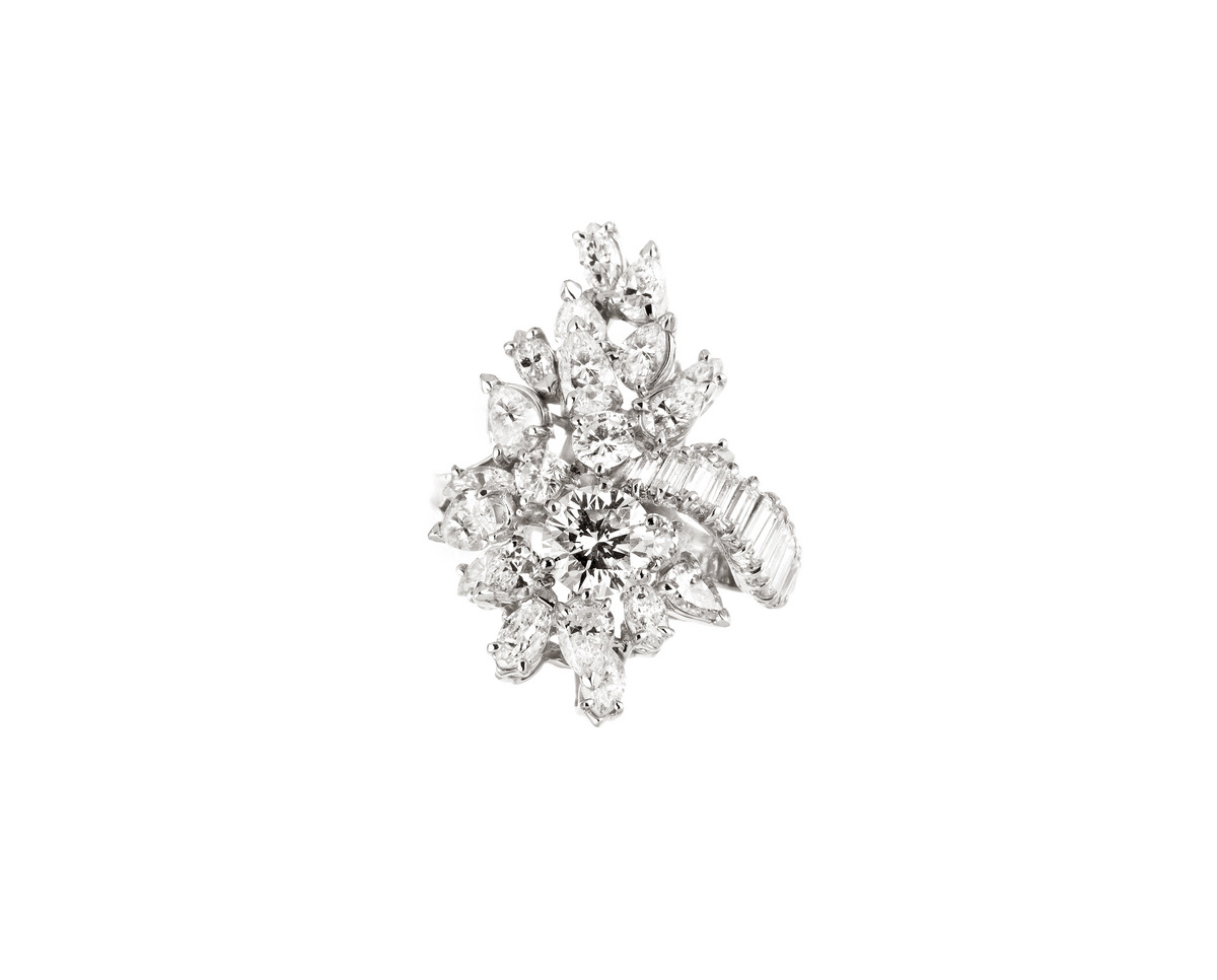 ANELLO IN PLATINO E DIAMANTI montatura traforata e sagomata a motivo fogliaceo decorato in diamanti taglio brillante rotondo, marquise, goccia e baguette per ct 4.80 circa, al centro un diamante rotondo di ct 1.00 circa, punzone Plat, mis. 18 DIAMOND AND PLATINUM COCKTAIL RING