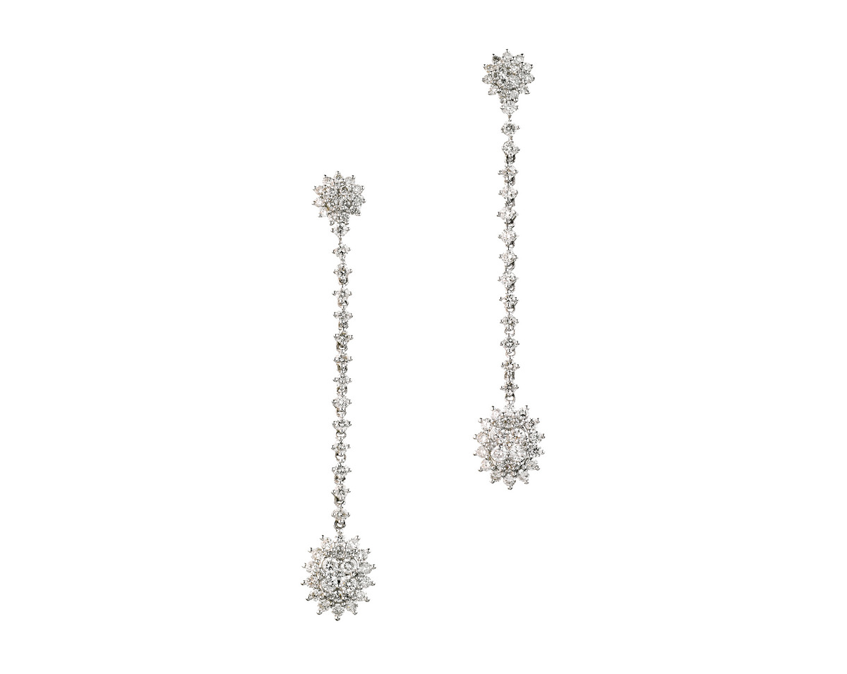 PAIO DI ORECCHINI PENDENTI IN ORO BIANCO E DIAMANTI realizzati con una corolla circolare in diamanti a cui è sospesa tramite una linea di diamanti taglio brillante rotondo una corolla ovale analogamente decorata, punzone 750, lungh. cm 5,5 PAIR OF DIAMOND AND WHITE GOLD PENDANT EARRINGS