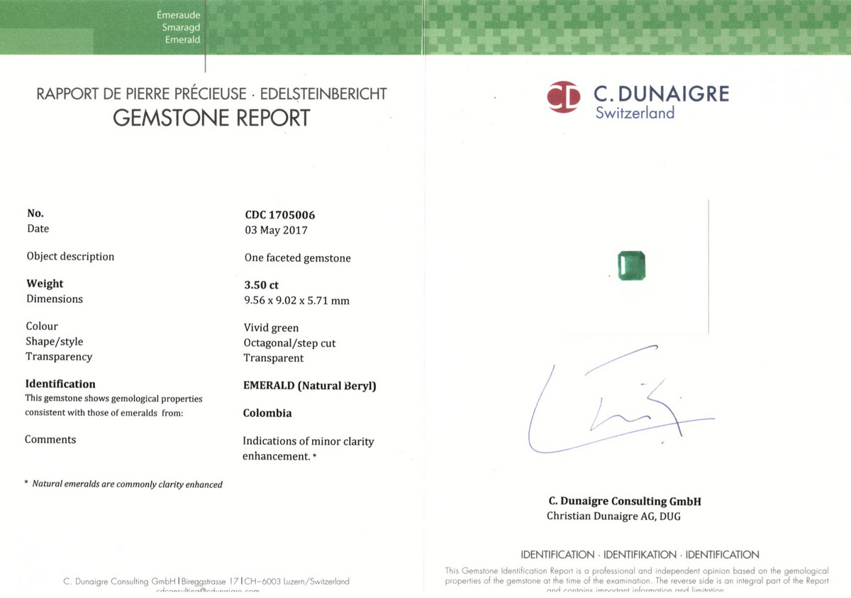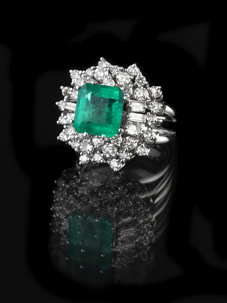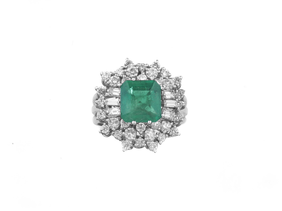 ANELLO IN ORO BIANCO, SMERALDO COLOMBIA E DIAMANTI al centro uno smeraldo taglio ottagonale di ct 3.50 entro corolla in diamanti, punzone 750, mis. 17 corredato di certificato C. Dunaigre n. CDC1705006 datato 05/2017 WHITE GOLD, COLOMBIAN EMERALD AND DIAMOND RING