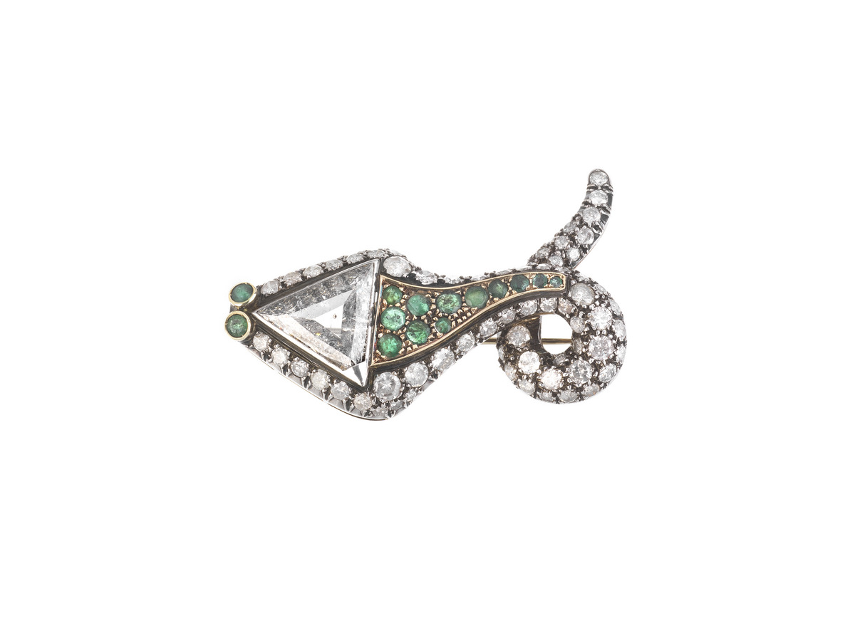SPILLA IN ARGENTO, ORO GIALLO, DIAMANTI E SMERALDI