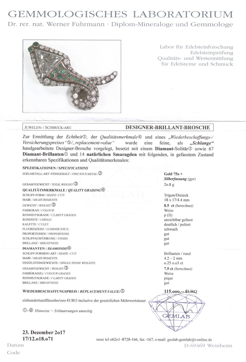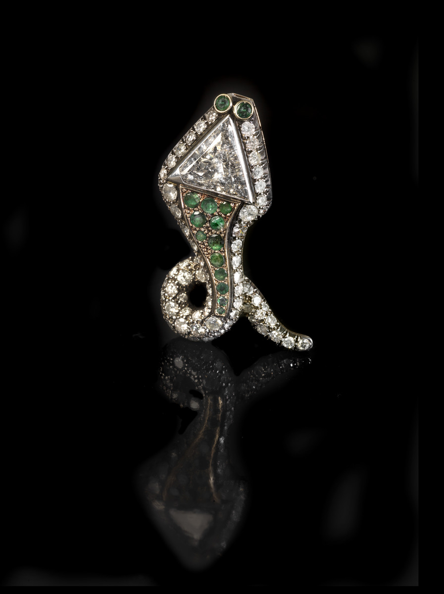 disegnata come un serpente, la testa impreziosita da un diamante taglio triangolare di ct 8.50 circa, il corpo decorato in smeraldi e diamanti taglio brillante rotondo per ct 7.50 circa, lungh. cm 5,5