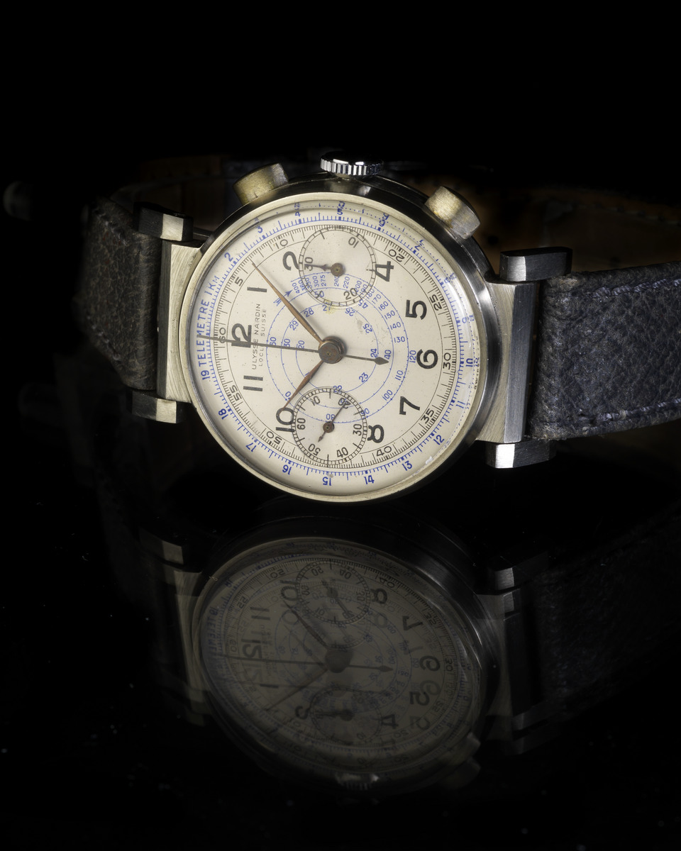 ULYSSE NARDIN, N. 104’988, ANNI ’30 OROLOGIO DA POLSO IN ACCIAIO CON CRONOGRAFO, DUE CONTATORI, SCALE TACHIMETRICA E TELEMETRICA, CORREDATO DI CERTIFICATO D’ORIGINE ULYSSE NARDIN CASSA: in tre corpi, fondello a scatto, pulsanti a oliva, anse mobili sfaccettate QUADRANTE: argentè con numeri arabi in smalto, due quadranti ausiliari con contatore dei 30 minuti e secondi continui, scala telemetrica periferica e tachimetrica a chiocciola, lancette a foglia, secondi cronografici al centro MOVIMENTO: a carica manuale calibro 14”C.H.R. Cal. Cassa, quadrante e movimento firmati DIAMETRO: mm 35 ULYSSE NARDIN, N. 104’988, CIRCA 1930 A STAINLESS STEEL CRONOGRAPH WITH REGISTERS, TACHYMETRE AND TELEMETRE SCALES, ACCOMPANIED BY A CERTIFICATE OF ORIGIN DIAM: 35 mm