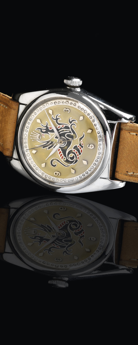 ROLEX "OVETTO", REF. N. 2940, ANNI ‘40 OROLOGIO DA POLSO IN ACCIAIO, AUTOMATICO, CON QUADRANTE IN SMALTI POLICROMI, FIBBIA ROLEX IN ACCIAIO CASSA: in tre corpi, fondello e corona vite, lunetta liscia, vetro plastica QUADRANTE: in smalto policromo decorato a dragone, indici geometrici e numeri arabi applicati, lancette a foglia, secondi al centro MOVIMENTO: a carica automatica calibro 9 ¾” DIAMETRO: mm 32 Cassa, quadrante e movimento firmati ROLEX "BUBBLEBACK", REF. 2940, CIRCA 1940 A STAINLESS STEEL SELF-WINDING WRISTWATCH WITH AN ENAMEL DIAL AND A STAINLESS STEEL ROLEX BUCKLE Case and movement signed DIAM.: 32 mm