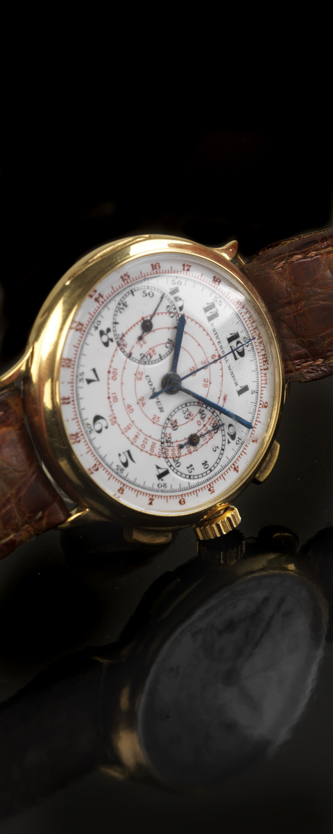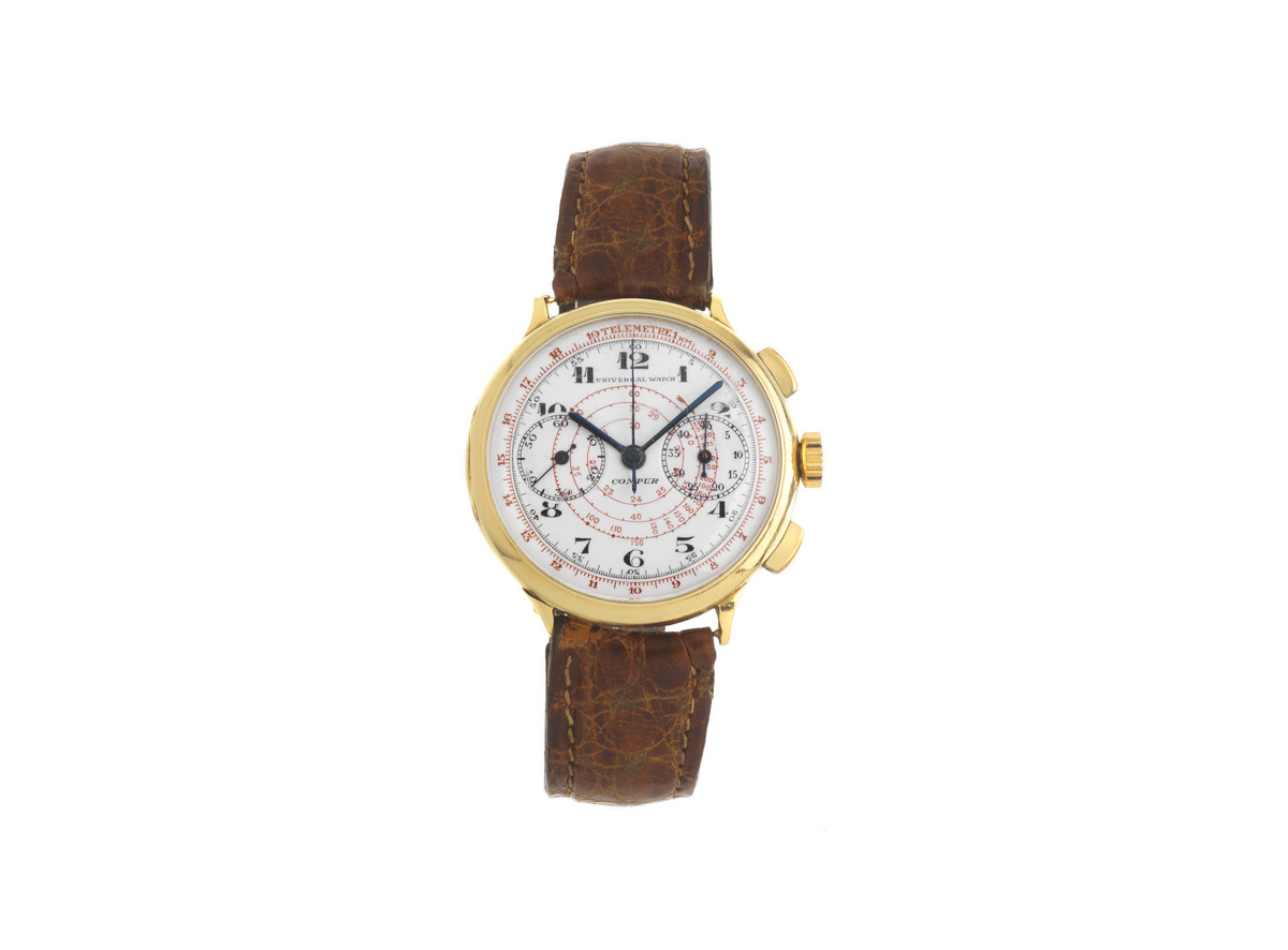 UNIVERSAL WATCH, COMPUR CHRONO, N. 574'386, 1935 CIRCA OROLOGIO DA POLSO IN ORO GIALLO 18 K CON CRONOGRAFO, CONTATORI, SCALE TELEMETRICA E TACHIMETRICA CASSA: in tre corpi, fondello a scatto con cerniera lateriale, pulsanti cronografici rettangolari QUADRANTE: in smalto bianco con numeri arabi, scala telemetrica periferica e tachimetrica a chiocciola in rosso, due quadranti ausiliari con contatore dei 45 minuti e secondi continui, lancette a spada blu MOVIMENTO: carica manuale, calibro 292 Cassa, quadrante e movimento firmati DIAMETRO: mm 38 UNIVERSAL WATCH, COMPUR CHRONO, N. 574'386, CIRCA 1935 18 K YELLOW GOLD CRONOGRAPH WITH REGISTER, TACHOMETER AND TELEMETER Case, dial and movement signed DIAM.: 38 mm