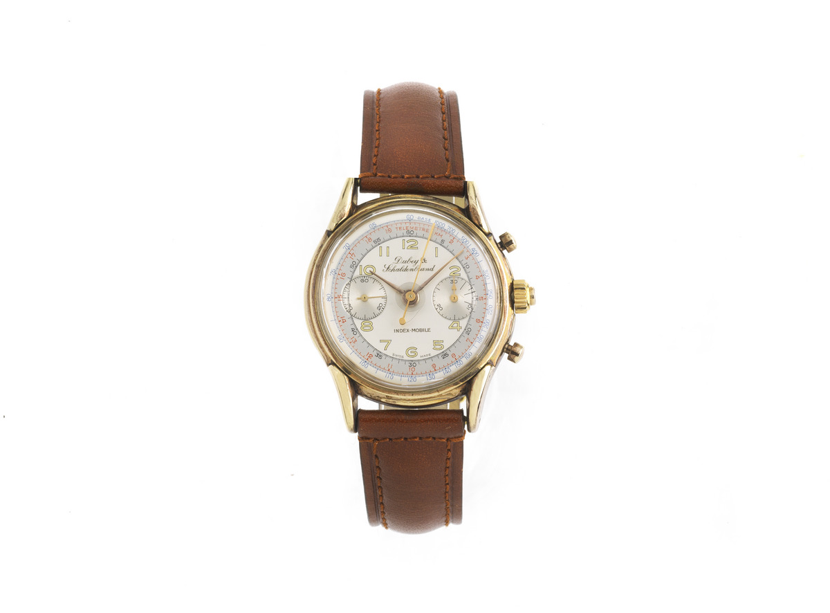 DUBEY & SCHALDENBRAND, INDEX MOBILE, ANNI ‘60 OROLOGIO DA POLSO IN ACCIAIO E ORO CON CRONOGRAFO RATTRAPANTE, REGISTRI, SCALE TELEMETRICA E TACHIMETRICA CASSA: in tre corpi in oro rosa placcato e acciaio, fondello a scatto, anse curve, pulsanti cronografici tondi QUADRANTE: argenté con numeri arabi in oro, scale tachimetrica e telemetrica periferiche in rosso e blu, due quadranti ausiliari con contatore dei 30 minuti e secondi continui MOVIMENTO: a carica manuale, con spirale sulla lancetta inferiore del rattrapante, Landeron cal. 54 marcato GALLE & CO. DIAMETRO: mm 37,5 DUBEY & SCHALDENBRAND, INDEX MOBILE, 1960s A STAINLESS STEEL AND GOLD PLATED SPLIT SECOND CHRONOGRAPH WITH REGISTER, TACHOMETER AND TELEMETER DIAM.: 37,5 mm