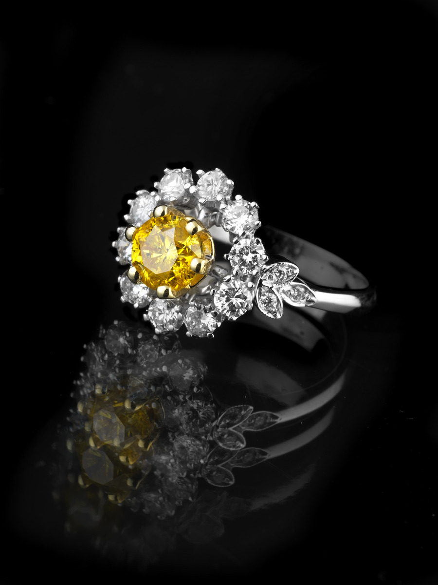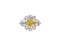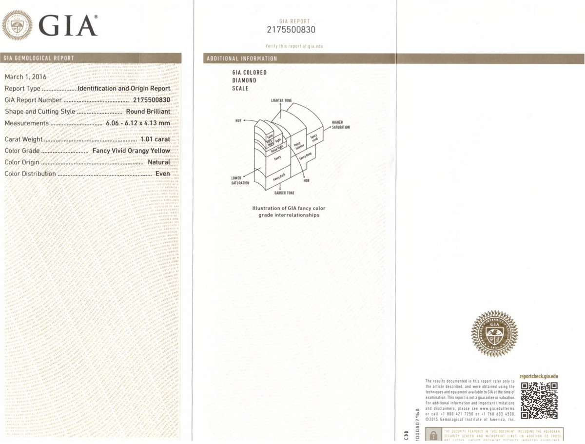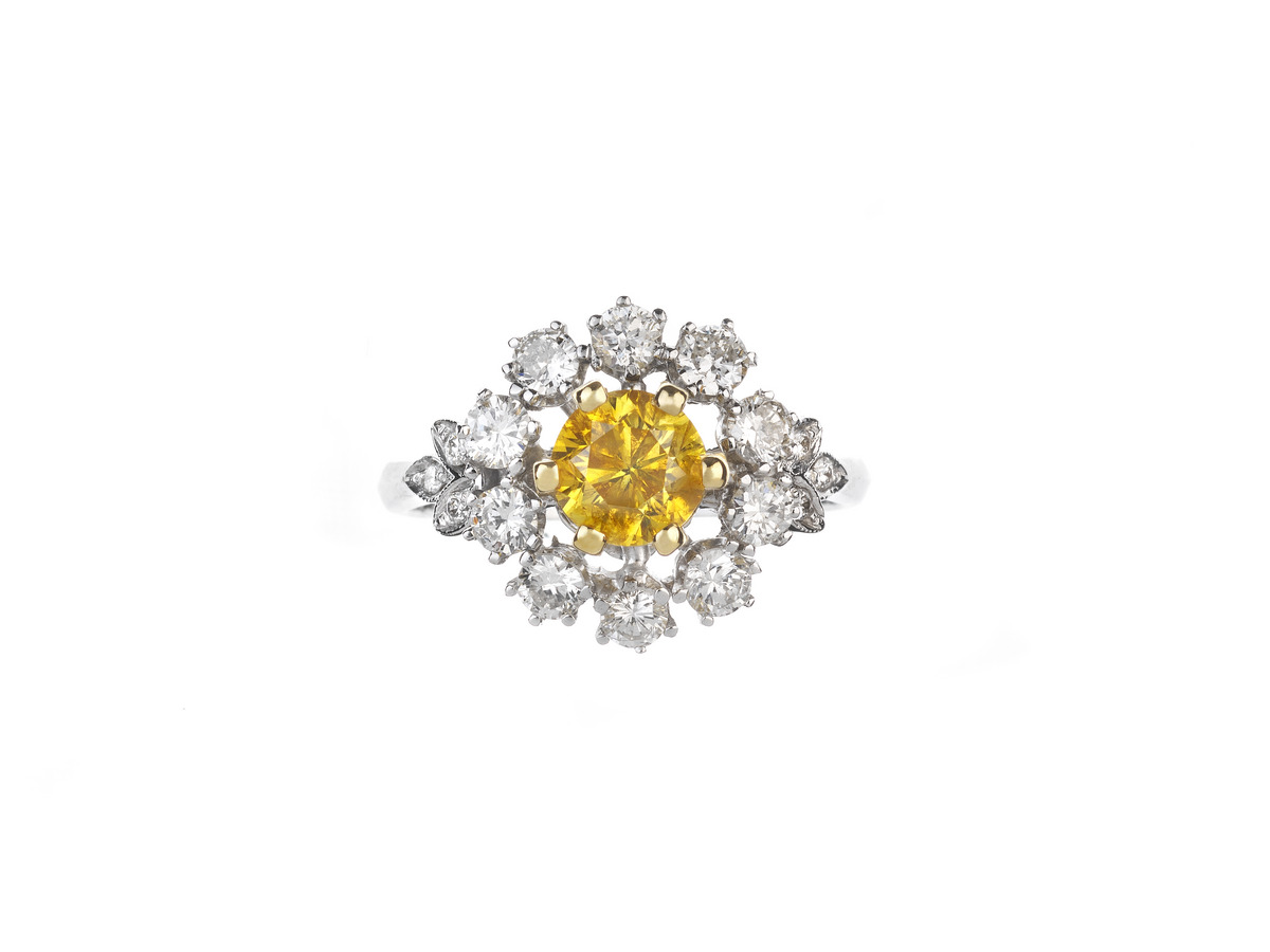 ANELLO IN ORO BIANCO, DIAMANTE FANCY E DIAMANTI INCOLORI al centro un diamante Fancy Vivid Orangy Yellow taglio brillante rotondo di ct 1.01 entro corolla in brillanti, mis. 15 corredato di certificato GIA n. 2175500830 datato 03/2016 WHITE GOLD, FANCY VIVID ORANGY YELLOW DIAMOND AND COLOURLESS DIAMOND RING