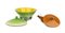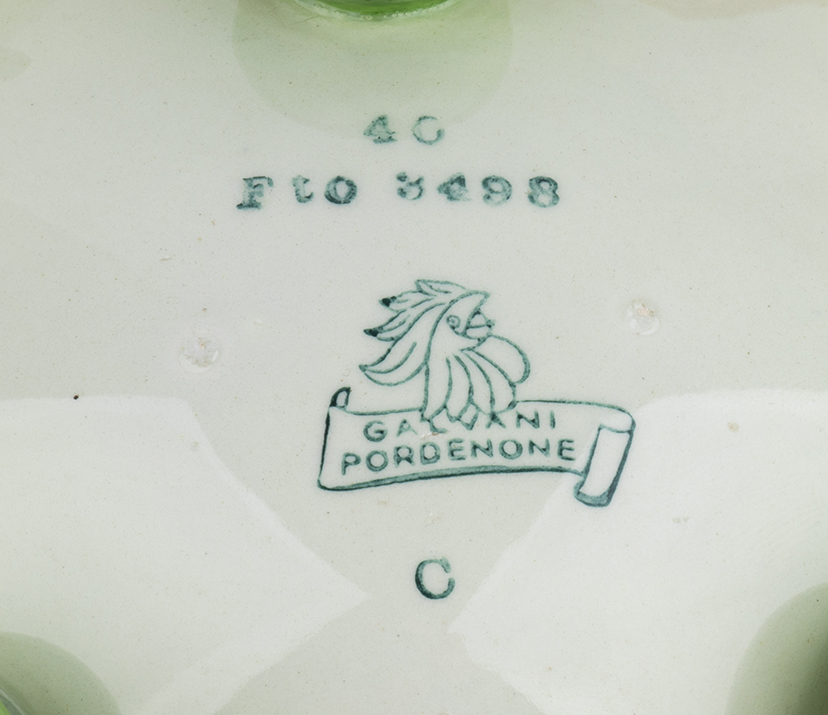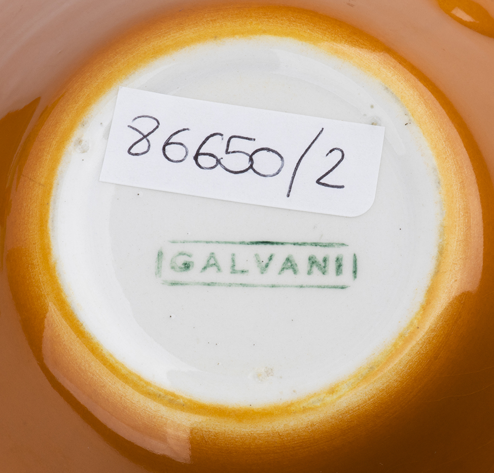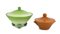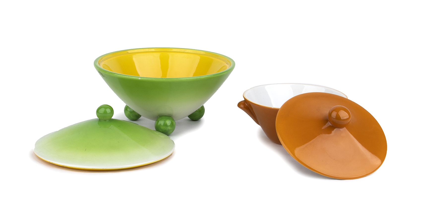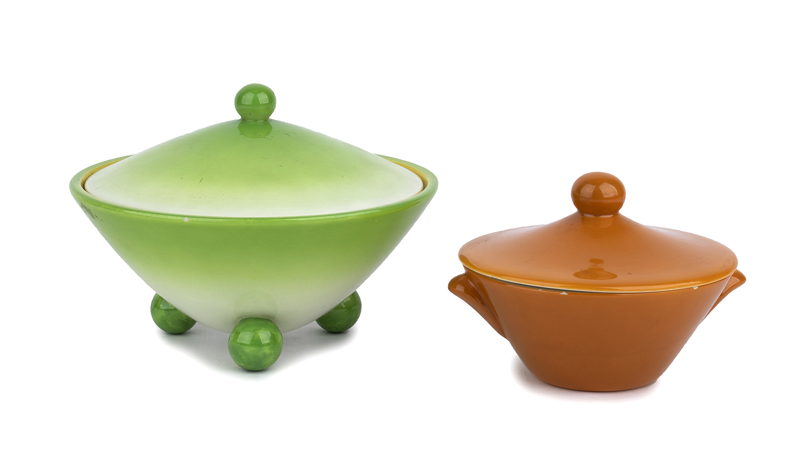 GALVANI - PORDENONE Due ciotole con coperchio e piedini sferici arancione e verde dipinte all’aerografo futurista, periodo Angelo Simonetto, Anni ‘30 Ceramica dipinta, arancione 9,5 x 12,5 cm; verde 13 x 17,5 cm Marchio sotto la base: GALVANI