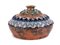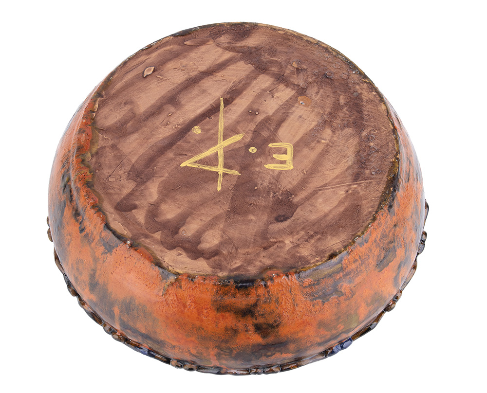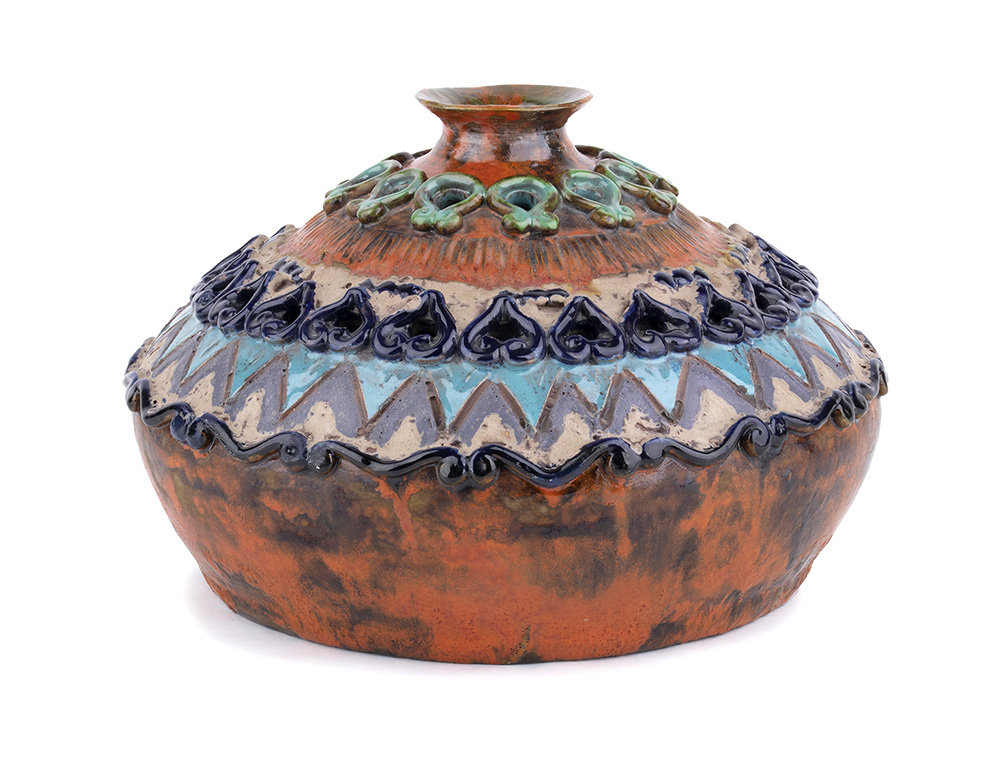 EMILIA PALOMBA Vaso tondo lavorato a motivi geometrici Terracotta dipinta, 16 x 22 cm Firma incisa sotto la base: E. P.