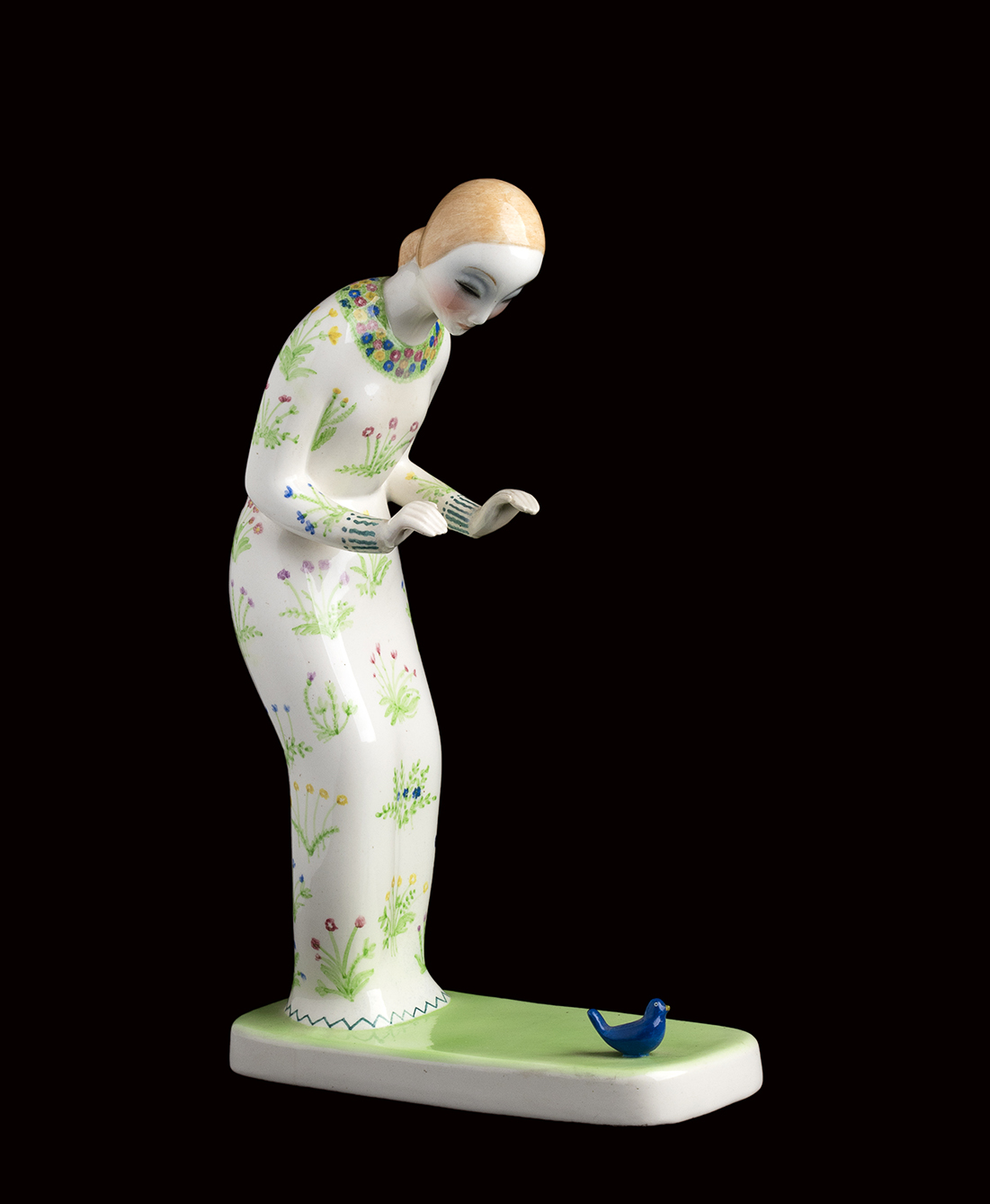 LENCI - TORINO Fanciulla con uccellino Scultura in ceramica dipinta, 30 x 17 x 7 cm Marchio sotto la base: Lenci Made in Italy, Torino 9-XI-F